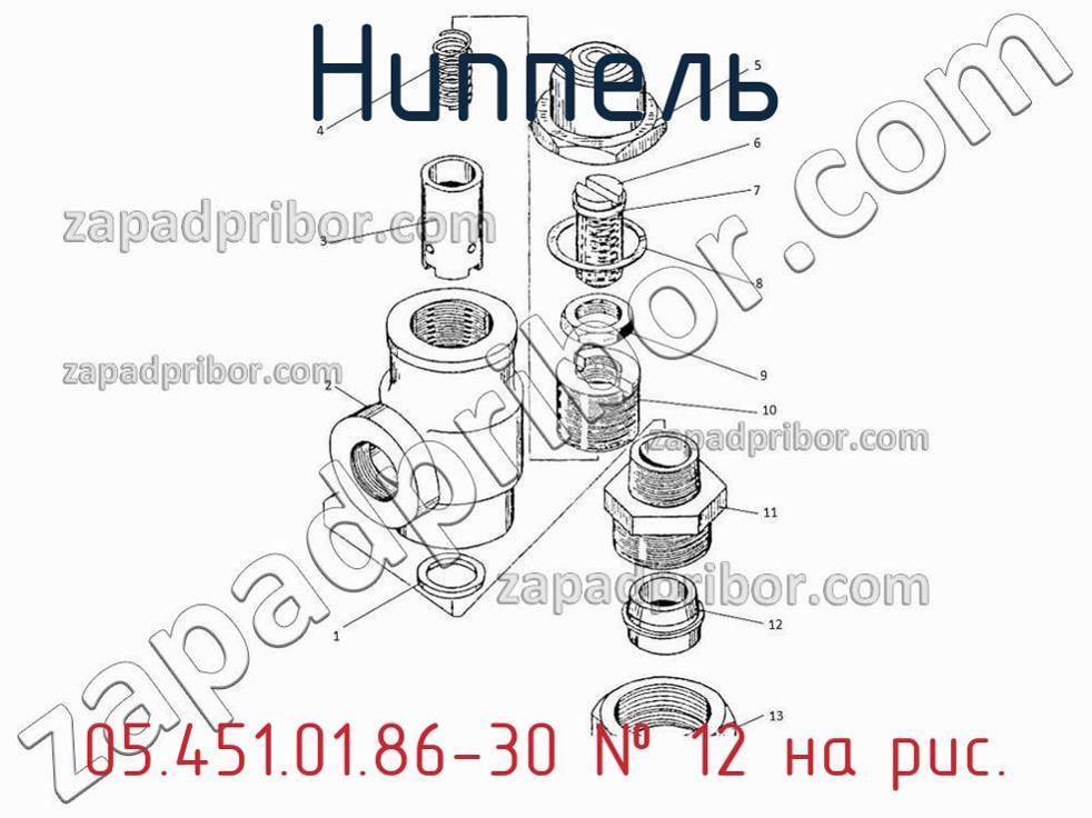 Наш отдел технического контроля гарантирует отсутствие брака или других несоответствий в технической документации или комплектации всех ниппелей представленных на нашем сайте. Чтобы заказать 05.451.01.86-30 обращайтесь в отдел продаж. Чтобы узнать цену, наличие, сроки поставки, срок гарантии и другие вопросы позвоните по телефонам указанным в контактах или оставьте заявку через форму обратной связи. Ниппель 05.451.01.86-30, номер 12 на чертеже, Комплект монтажных частей 57гр-067 и другие запасные части для ПДГ4А) , а также другие ниппели и похожие изделия представлены на сайте zapadpribor.com.