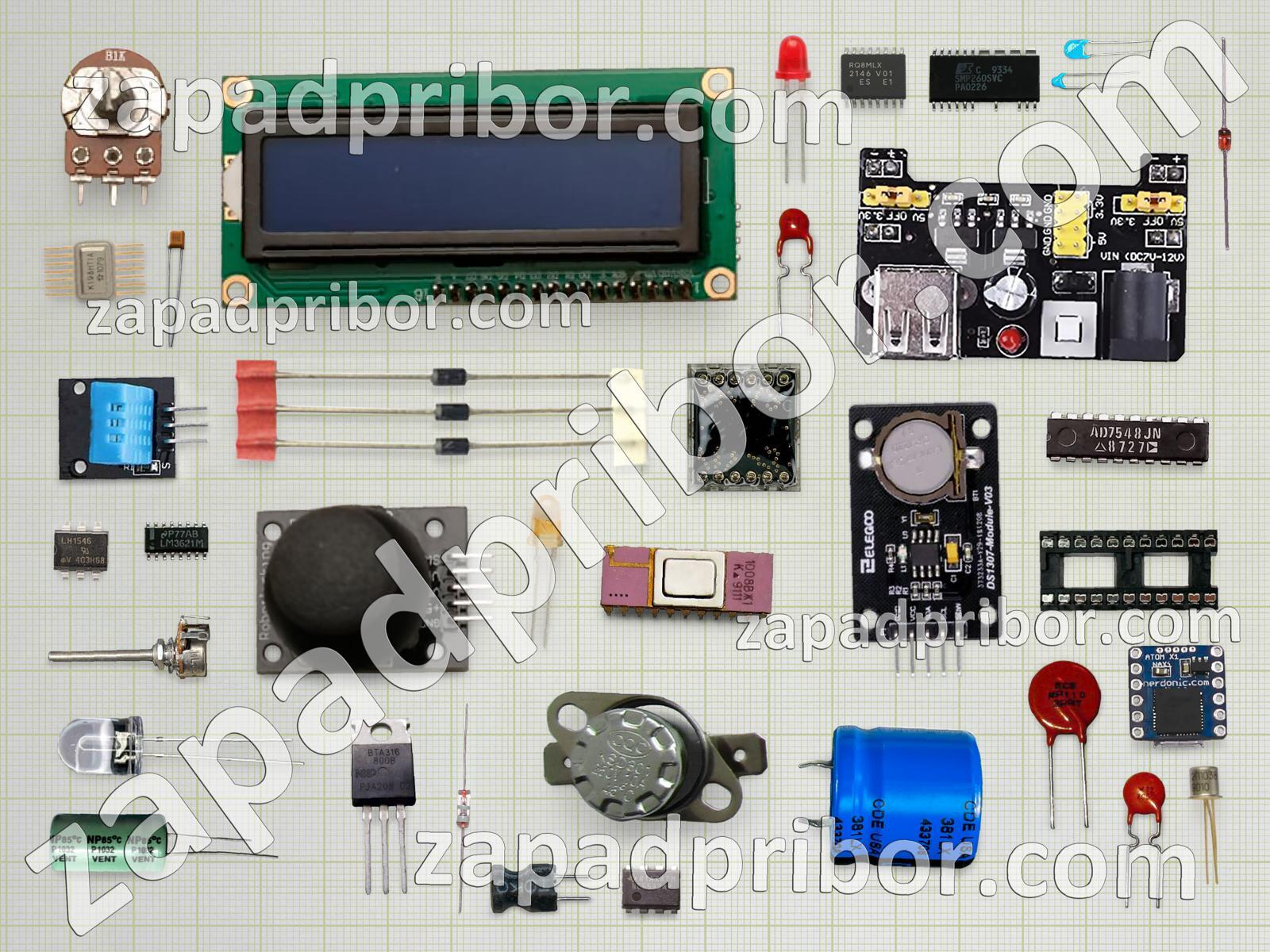 Кроме этих радиодеталей на нашем сайте вы сможете найти большой перечень компонентов. Осуществляйте поиск по основным типам радиодеталей таких как светодиод, датчик, усилитель, диод, резистор, переключатель, экран, резонатор, колодки, конденсатор, разъем, дроссель, фотодиод, трансформатор, реле, контакты, тиристор, дисплей, индуктивность, тумблер, транзистор, микросхема, соединитель, кнопка, адаптер, диодный мост, индикатор, преобразователь и другие.