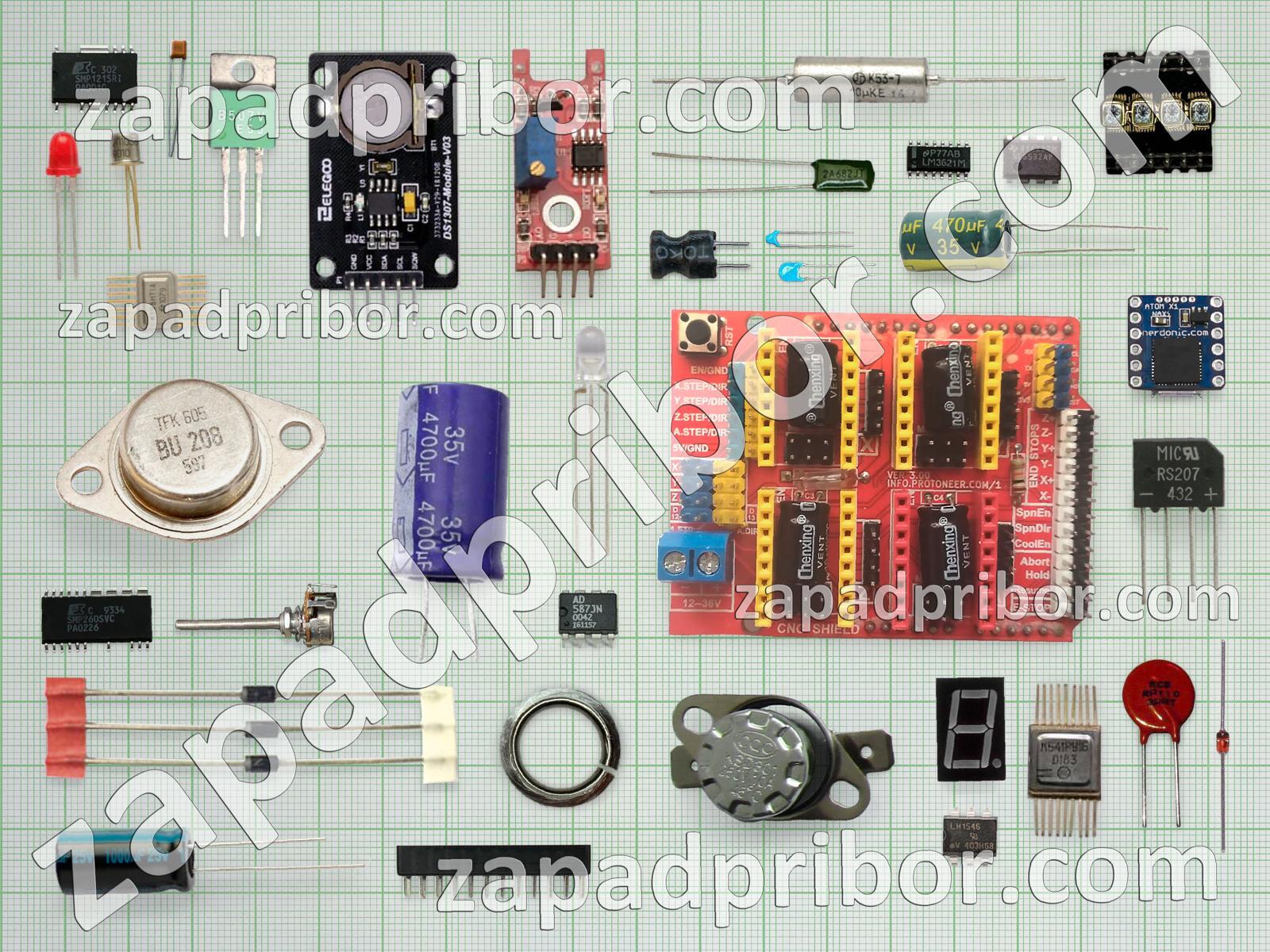 Кроме этих радиодеталей на нашем сайте вы сможете найти большой перечень компонентов. Осуществляйте поиск по основным типам радиодеталей таких как адаптер, экран, микросхема, колодки, дроссель, резонатор, разъем, дисплей, резистор, тумблер, фотодиод, преобразователь, кнопка, переключатель, индикатор, соединитель, контакты, диодный мост, датчик, реле, конденсатор, диод, индуктивность, тиристор, усилитель, светодиод, транзистор, трансформатор и другие.