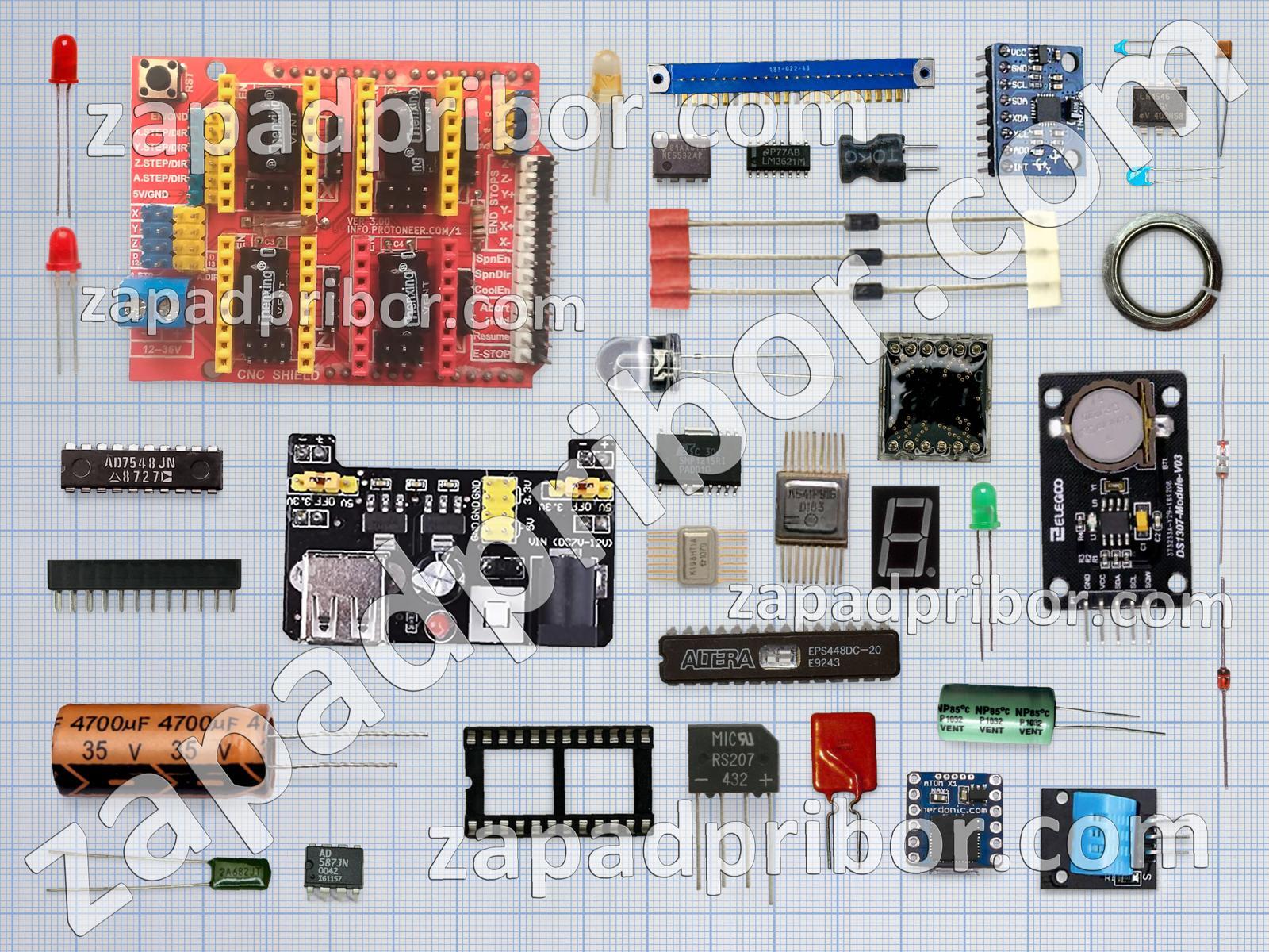 Кроме этих радиодеталей на нашем сайте вы сможете найти большой перечень компонентов. Осуществляйте поиск по основным типам радиодеталей таких как переключатель, индикатор, трансформатор, соединитель, резонатор, конденсатор, датчик, индуктивность, преобразователь, тумблер, колодки, резистор, экран, диод, фотодиод, контакты, реле, светодиод, дисплей, адаптер, дроссель, диодный мост, усилитель, кнопка, микросхема, транзистор, разъем, тиристор и другие.
