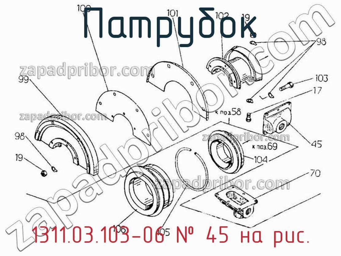 Наш ОТК гарантирует отсутствие брака у всех патрубков представленных на нашем сайте. Для заказа 1311.03.103-06 обращайтесь в отдел продаж. Информация о цене, наличии, сроках поставки, сроке гарантии и по других вопросах обращайтесь по телефонам, указанным в контактах или оставьте заявку через форму обратной связи. Патрубок 1311.03.103-06, номер 45 на чертеже, Турбокомпрессор 00гр. — 065 и другие запасные части для , а также другие патрубки и похожие изделия представлены на сайте zapadpribor.com.