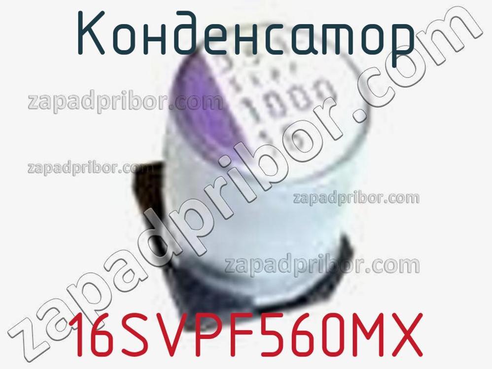 Основные характеристики конденсатора 16SVPF560MX : 16SVPF560MXКонденсаторы полимерныекол-во в упаковке: 500Алюминиевые конденсаторы с органическим полимером 16VDC 560uF 18mOhm 3900mAr.m.s_x000D_