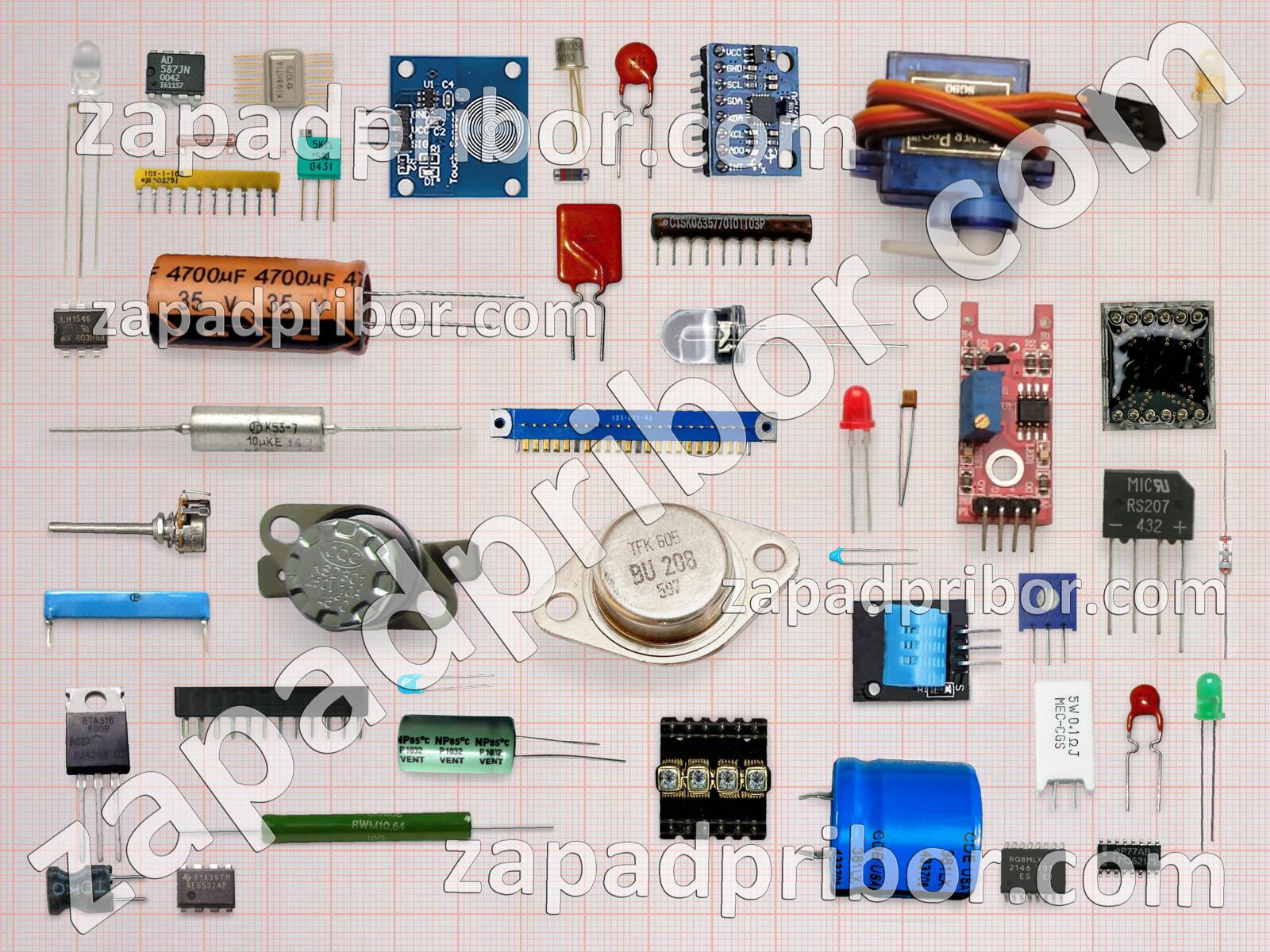 Кроме этих радиодеталей на нашем сайте вы сможете найти большой перечень компонентов. Осуществляйте поиск по основным типам радиодеталей таких как тумблер, экран, конденсатор, резистор, тиристор, диодный мост, индуктивность, преобразователь, дисплей, колодки, светодиод, усилитель, фотодиод, индикатор, адаптер, диод, транзистор, микросхема, резонатор, соединитель, реле, разъем, переключатель, контакты, дроссель, датчик, трансформатор, кнопка и другие.