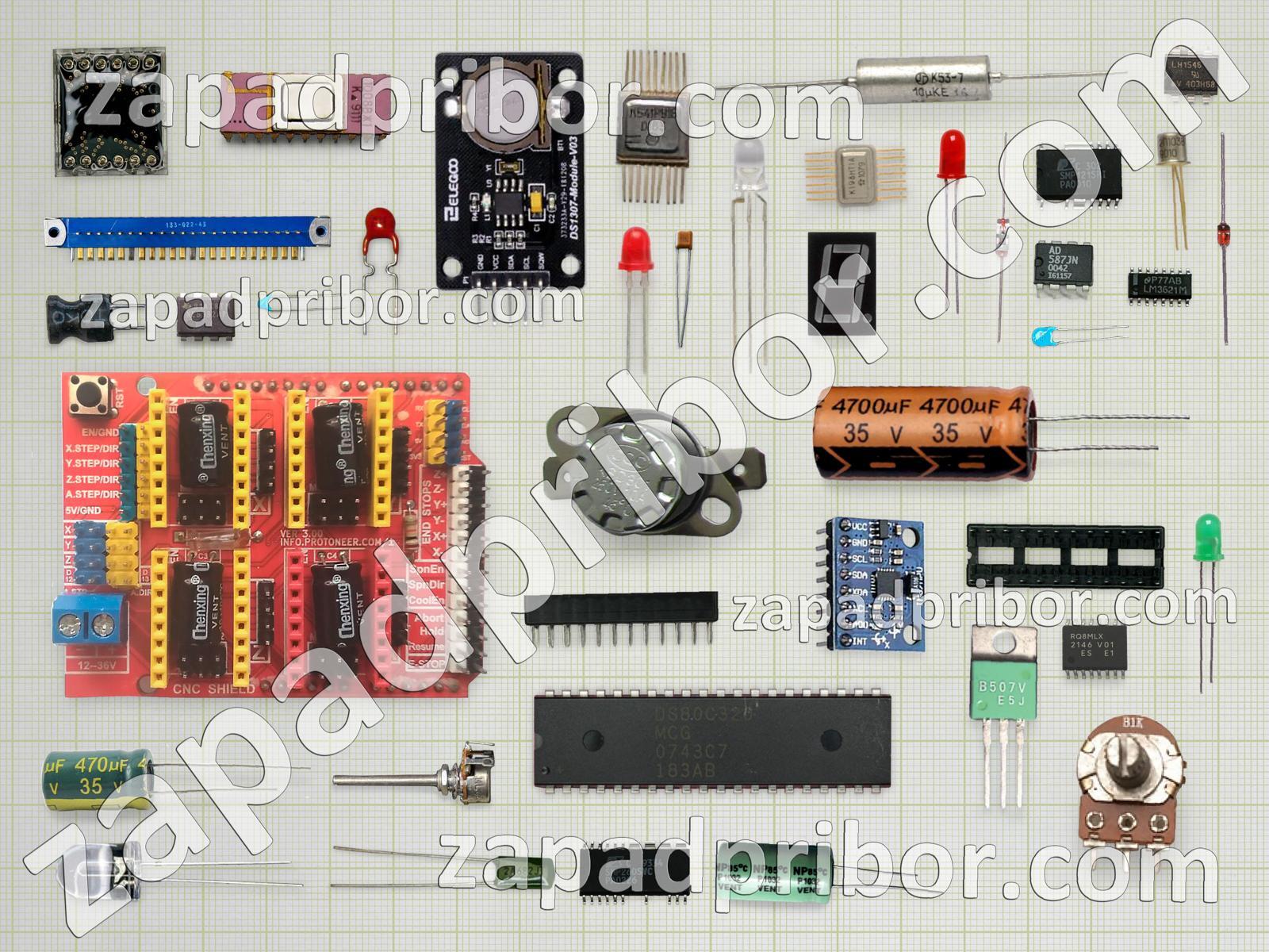 Кроме этих радиодеталей на нашем сайте вы сможете найти большой перечень компонентов. Осуществляйте поиск по основным типам радиодеталей таких как конденсатор, индуктивность, дисплей, разъем, тумблер, резистор, экран, фотодиод, колодки, реле, микросхема, светодиод, датчик, адаптер, индикатор, преобразователь, трансформатор, резонатор, усилитель, кнопка, контакты, диодный мост, соединитель, дроссель, переключатель, диод, транзистор, тиристор и другие.