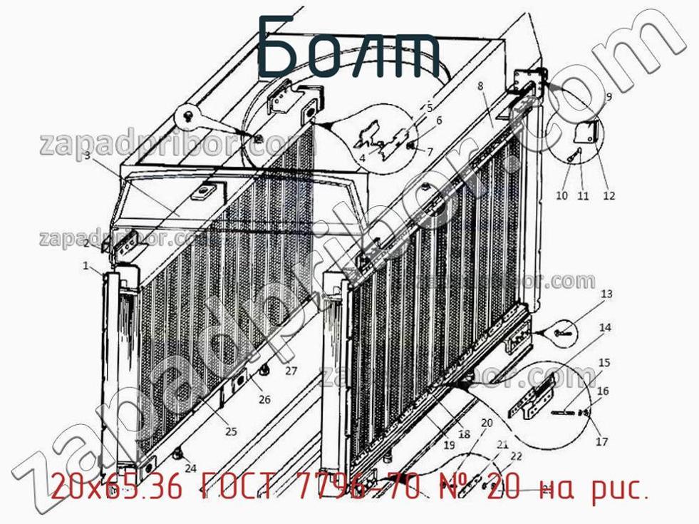 Наш отдел технического контроля гарантирует отсутствие брака и других несоответствий технической документации у всех болтов представленных на нашем сайте. По вопросам покупки 20х65.36 ГОСТ 7796-70 обращайтесь в отдел продаж. Для информации о цене, наличии, сроках поставки, сроке гарантии и по других вопросах обращайтесь по телефонам, указанным в контактах или оставьте запрос через форму обратной связи. Болт 20х65.36 ГОСТ 7796-70, номер 20 на чертеже, Установка охлаждающих секций и коллекторов ТЭМ2.10.30.002 и другие запасные части для , а также другие болты и похожие изделия представлены на сайте zapadpribor.com.