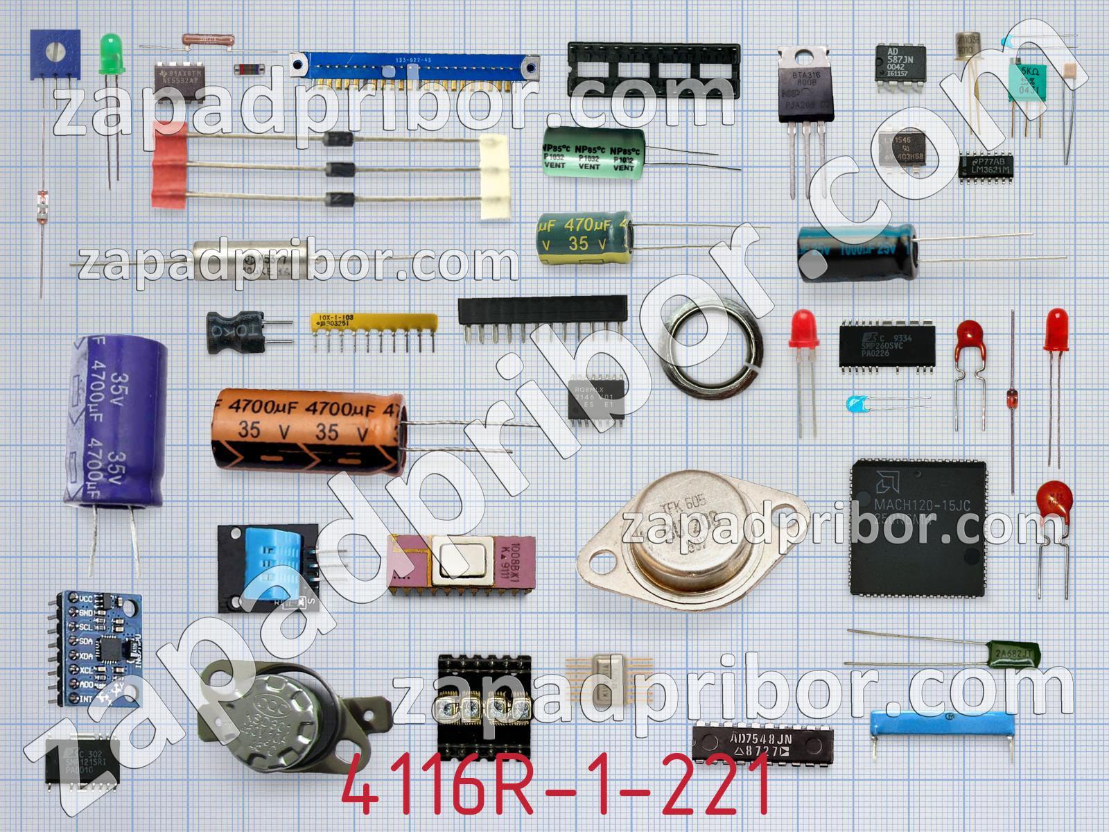 Основные характеристики резисторной сборки 4116R-1-221 : 4116R-1-221Resistors/ Resistor Networks, Arrays220 Ohm В±2% 250mW Power Per Element Isolated 8 Resistor Network/Array В±100ppm/В°C 16-DIP (0.300", 7.62mm)