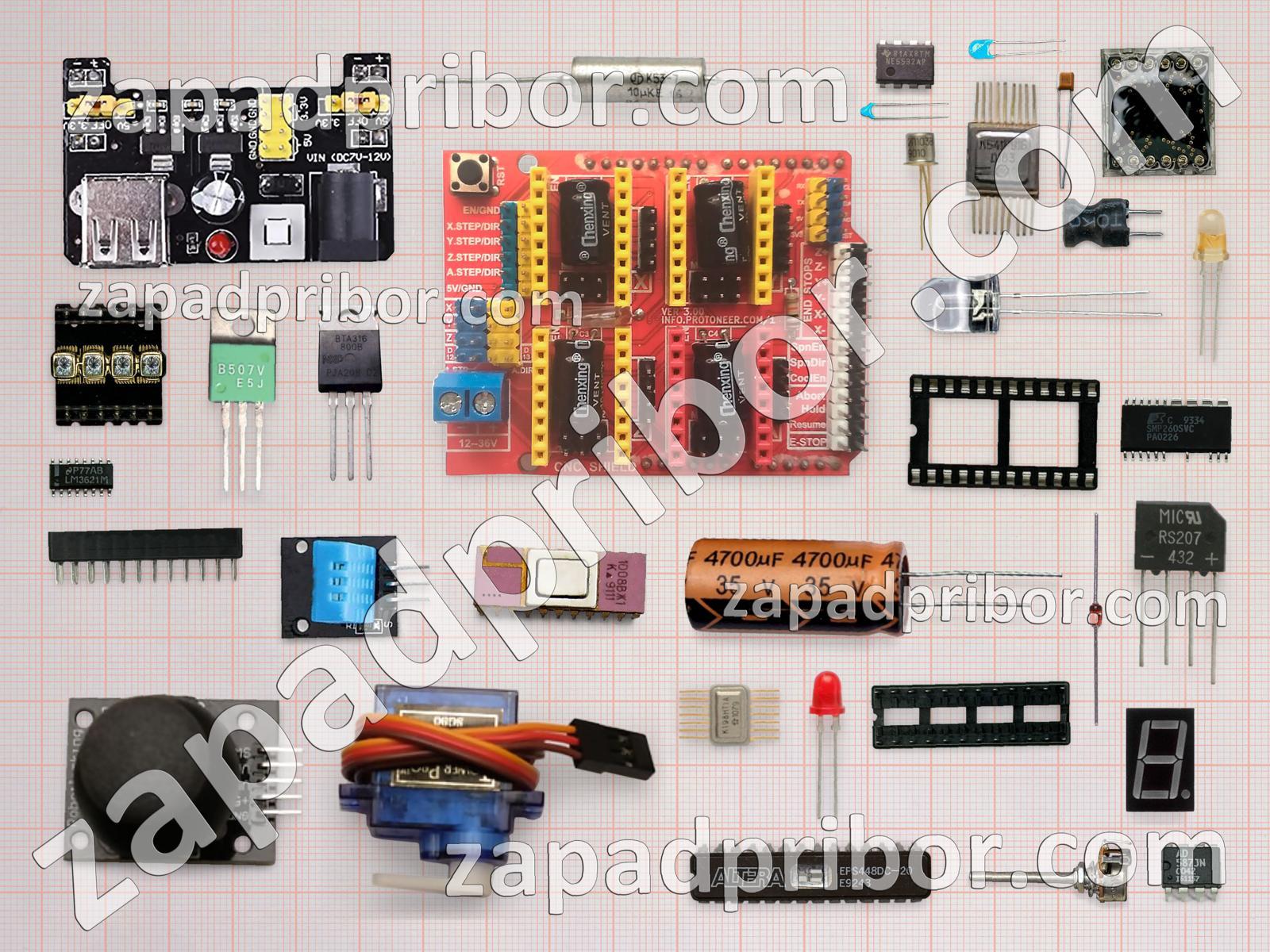Кроме этих радиодеталей на нашем сайте вы сможете найти большой перечень компонентов. Осуществляйте поиск по основным типам радиодеталей таких как разъем, конденсатор, тиристор, контакты, соединитель, переключатель, резонатор, экран, кнопка, трансформатор, индуктивность, диод, диодный мост, реле, датчик, дроссель, светодиод, транзистор, индикатор, фотодиод, колодки, усилитель, преобразователь, дисплей, тумблер, резистор, микросхема, адаптер и другие.