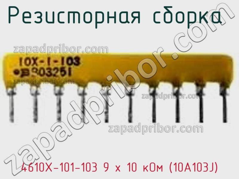 Основные характеристики резисторной сборки 4610X-101-103 9 х 10 кОм (10A103J) : 4610X-101-103 9 х 10 кОм (10A103J) Резисторные сборки представляют собой единый корпус, в котором содержатся два или более резистора. Корпус имеет многочисленные выводы, через которые осуществляется соединение элементов сборки с внешней схемой.