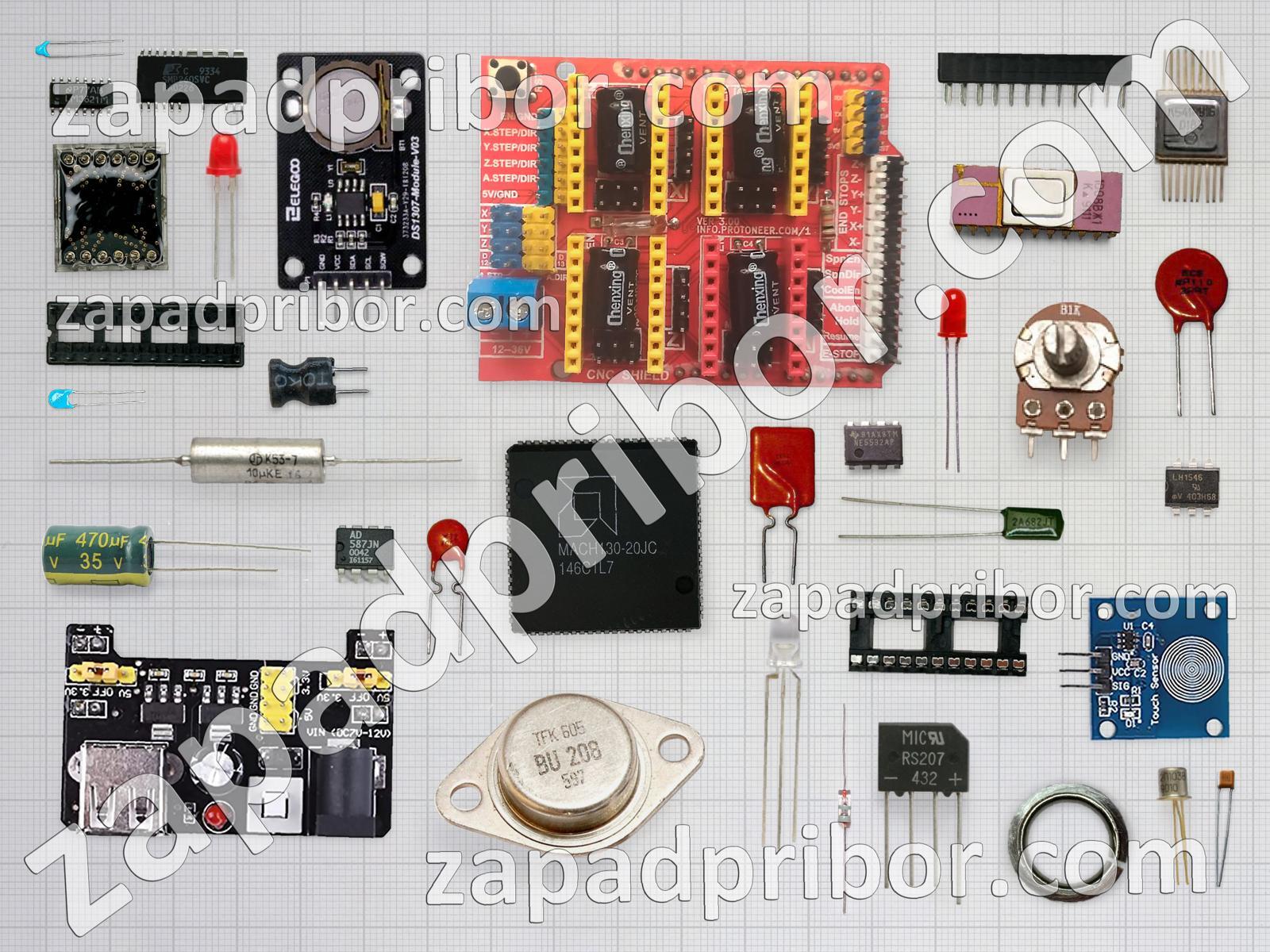 Кроме этих радиодеталей на нашем сайте вы сможете найти большой перечень компонентов. Осуществляйте поиск по основным типам радиодеталей таких как транзистор, переключатель, микросхема, преобразователь, адаптер, трансформатор, резонатор, контакты, разъем, индуктивность, диод, тиристор, дисплей, соединитель, усилитель, экран, светодиод, резистор, конденсатор, реле, кнопка, датчик, диодный мост, дроссель, индикатор, колодки, тумблер, фотодиод и другие.