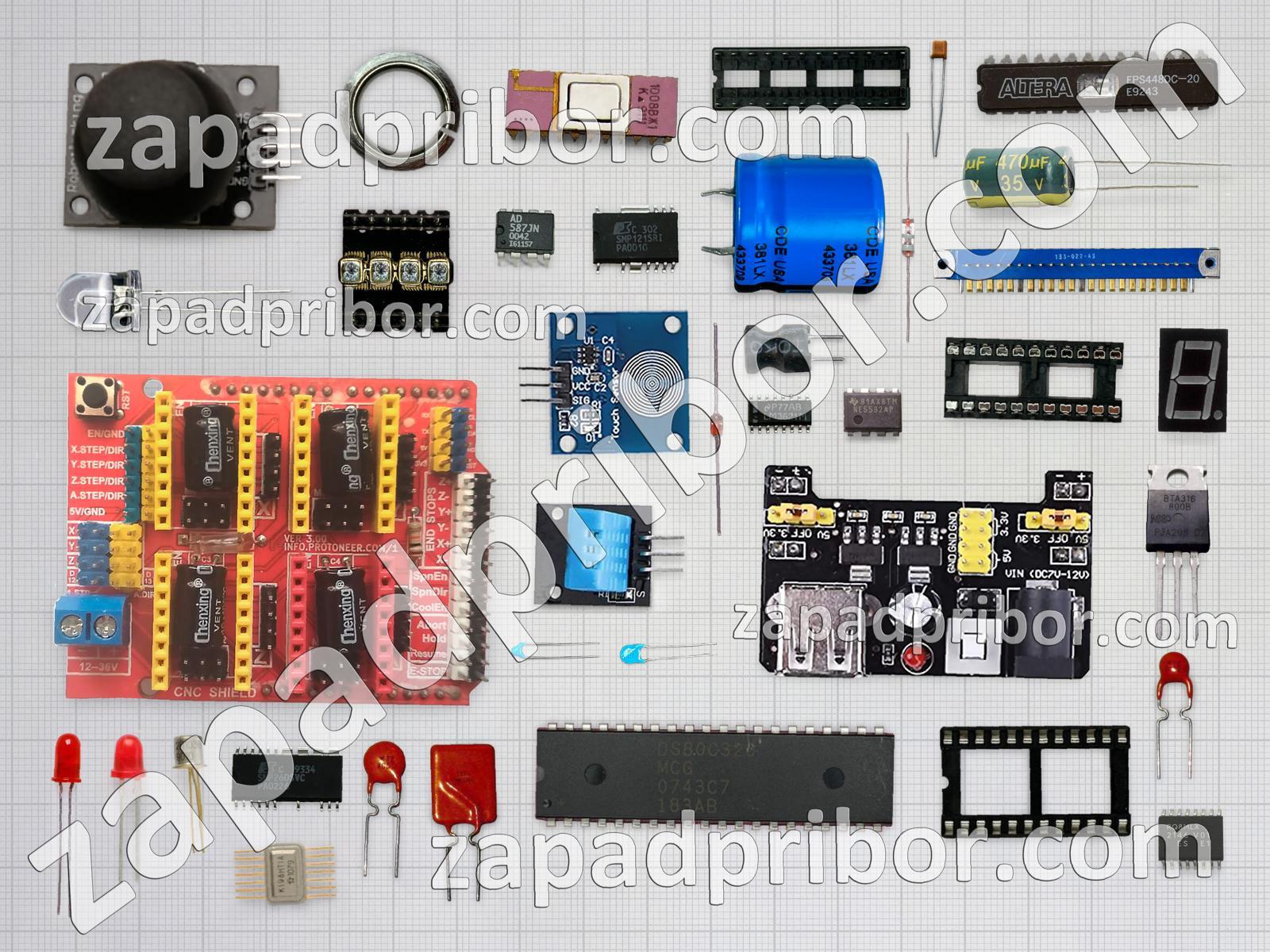 Кроме этих радиодеталей на нашем сайте вы сможете найти большой перечень компонентов. Осуществляйте поиск по основным типам радиодеталей таких как индикатор, адаптер, диод, конденсатор, разъем, трансформатор, микросхема, транзистор, тиристор, усилитель, диодный мост, соединитель, дисплей, переключатель, фотодиод, контакты, дроссель, реле, датчик, колодки, светодиод, кнопка, резонатор, индуктивность, преобразователь, экран, резистор, тумблер и другие.