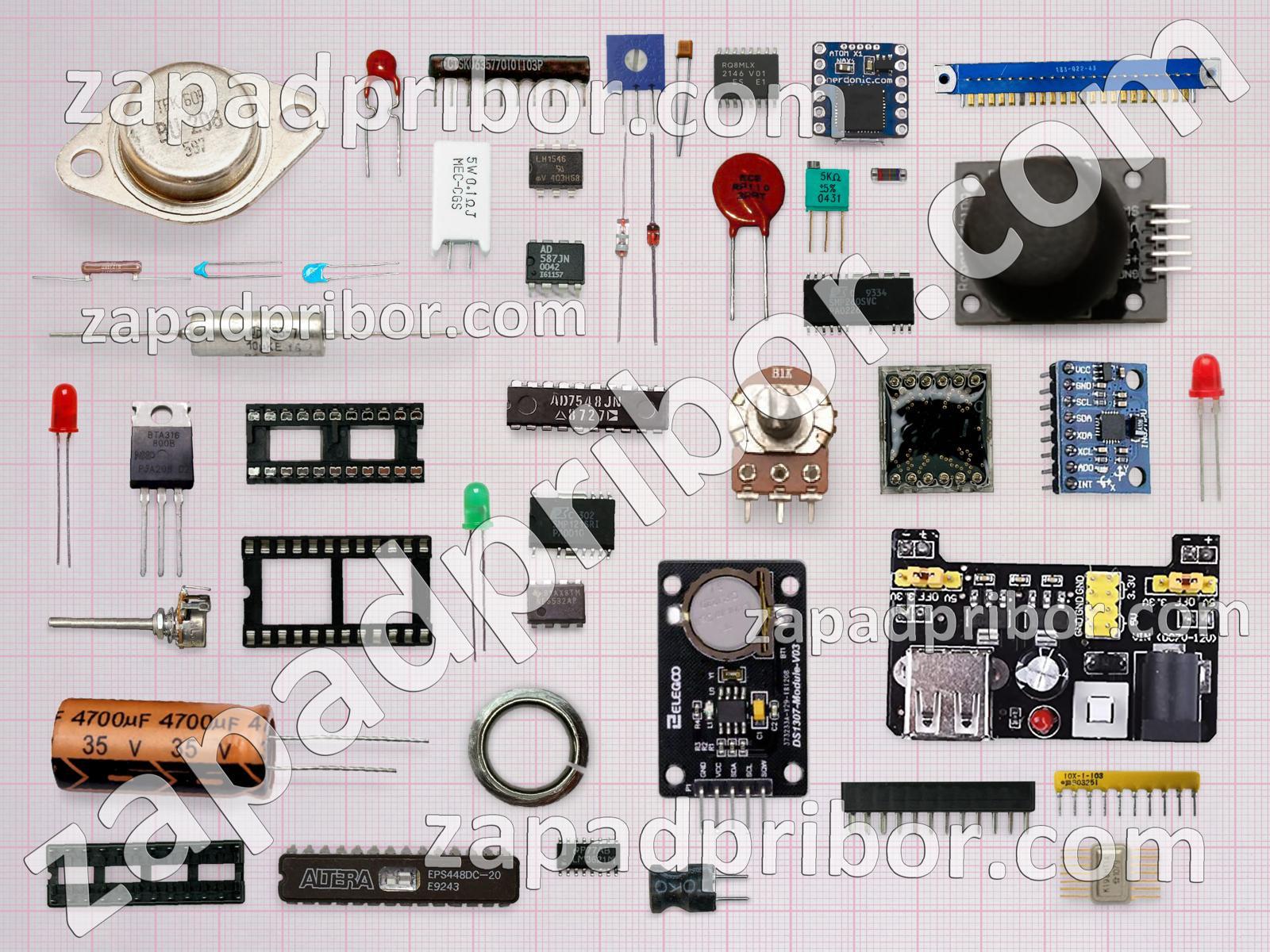Кроме этих радиодеталей на нашем сайте вы сможете найти большой перечень компонентов. Осуществляйте поиск по основным типам радиодеталей таких как дроссель, адаптер, соединитель, диодный мост, датчик, тиристор, микросхема, трансформатор, транзистор, светодиод, индуктивность, резонатор, конденсатор, кнопка, дисплей, усилитель, преобразователь, тумблер, индикатор, резистор, разъем, реле, экран, диод, переключатель, контакты, колодки, фотодиод и другие.