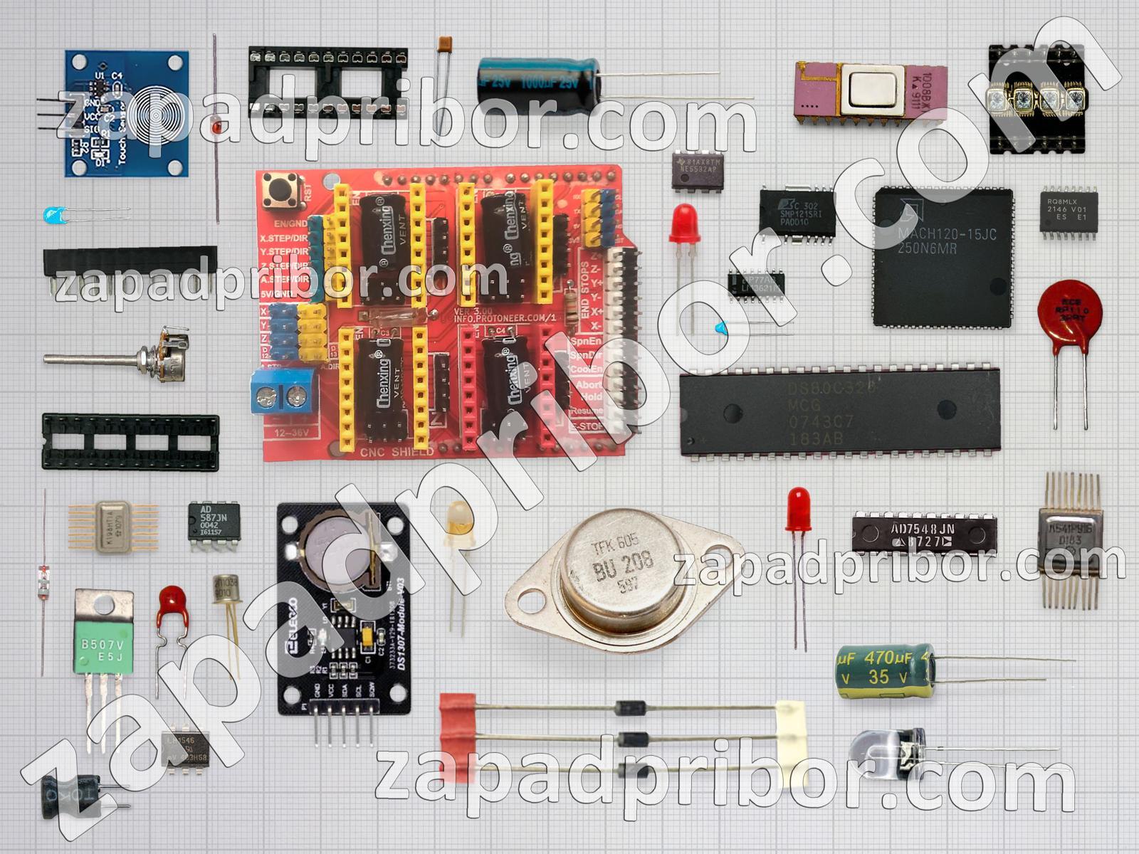 Кроме этих радиодеталей на нашем сайте вы сможете найти большой перечень компонентов. Осуществляйте поиск по основным типам радиодеталей таких как адаптер, экран, соединитель, дроссель, преобразователь, диодный мост, резонатор, реле, транзистор, диод, кнопка, микросхема, усилитель, контакты, светодиод, фотодиод, тиристор, разъем, резистор, конденсатор, индикатор, дисплей, датчик, переключатель, колодки, трансформатор, тумблер, индуктивность и другие.