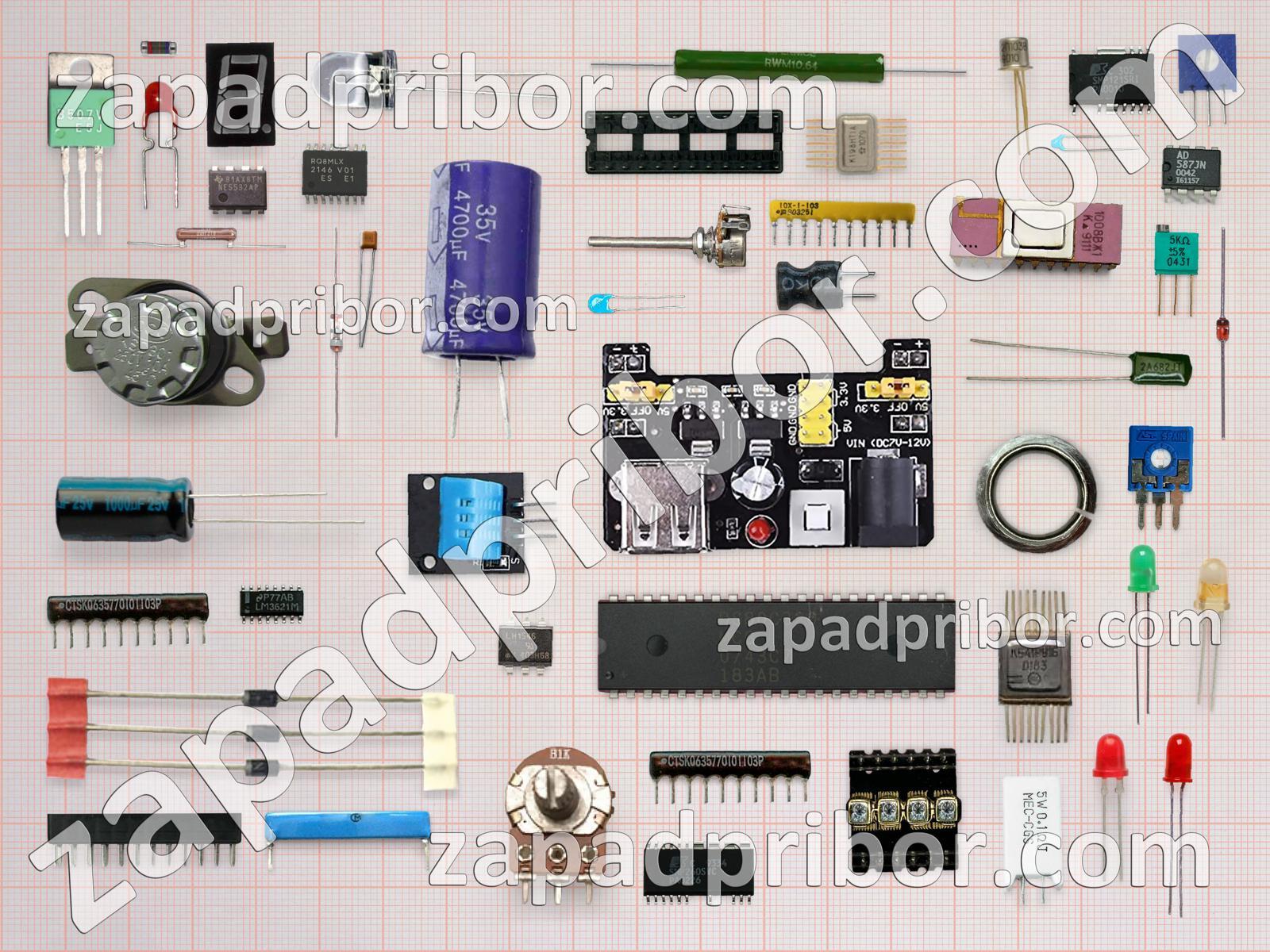 Кроме этих радиодеталей на нашем сайте вы сможете найти большой перечень компонентов. Осуществляйте поиск по основным типам радиодеталей таких как преобразователь, фотодиод, индикатор, переключатель, трансформатор, конденсатор, разъем, тиристор, резонатор, датчик, реле, дроссель, индуктивность, соединитель, колодки, кнопка, экран, усилитель, транзистор, диод, диодный мост, контакты, адаптер, тумблер, светодиод, резистор, микросхема, дисплей и другие.