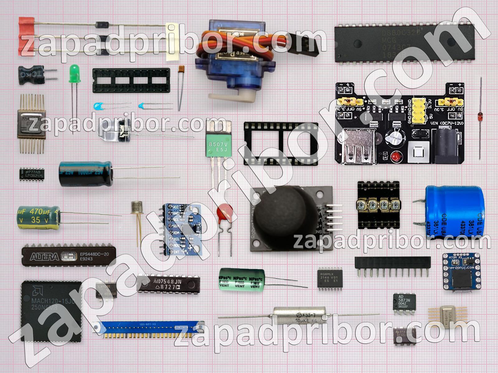Кроме этих радиодеталей на нашем сайте вы сможете найти большой перечень компонентов. Осуществляйте поиск по основным типам радиодеталей таких как реле, светодиод, индикатор, кнопка, резистор, диодный мост, тиристор, переключатель, индуктивность, адаптер, дисплей, преобразователь, диод, датчик, разъем, резонатор, дроссель, усилитель, контакты, колодки, микросхема, транзистор, конденсатор, фотодиод, экран, тумблер, соединитель, трансформатор и другие.
