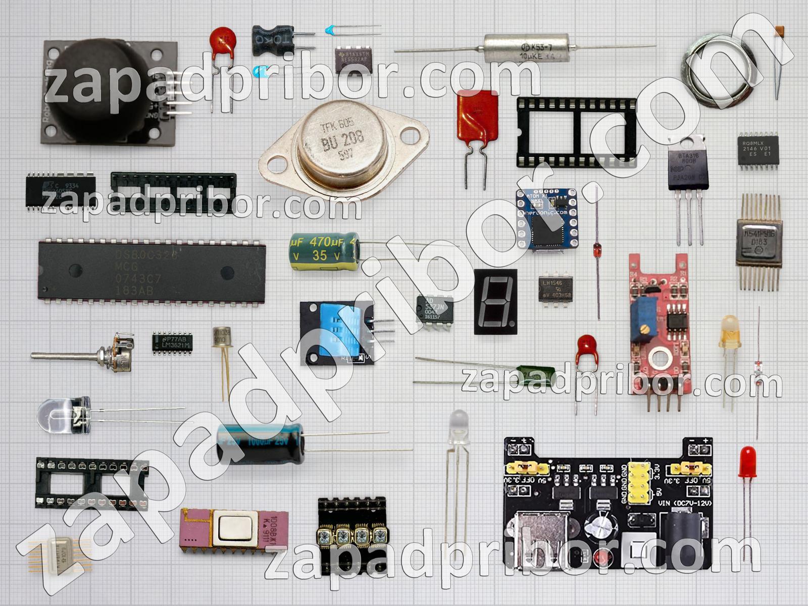 Кроме этих радиодеталей на нашем сайте вы сможете найти большой перечень компонентов. Осуществляйте поиск по основным типам радиодеталей таких как колодки, контакты, реле, трансформатор, конденсатор, диод, резонатор, соединитель, диодный мост, переключатель, резистор, тумблер, микросхема, дроссель, датчик, индикатор, кнопка, светодиод, фотодиод, дисплей, усилитель, тиристор, транзистор, индуктивность, разъем, преобразователь, адаптер, экран и другие.