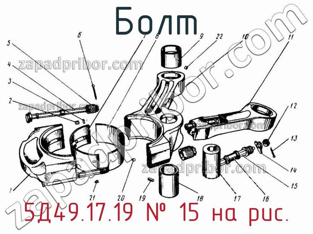 Мы даем гарантию на отсутствие брака или других несоответствий технической документации. По вопросам приобретения 5Д49.17.19 обращайтесь в отдел продаж. Наши менеджеры предоставят всю интересующую Вас информацию по поводу цены, наличия, сроков доставки, гарантии или ответят на любые другие вопросы. Болт шатунный, номер 15 на чертеже, Механизм шатунный 6Д49.17спч-2-01 и другие запасные части для 49 (Ч 26/26) , а также другие болты и похожие изделия представлены на сайте zapadpribor.com.
