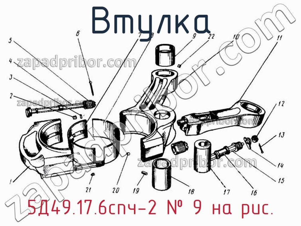 Компания со своей стороны гарантирует отсутствие каких-либо дефектов, несовершенств или неточностей у комплектации и документации втулки. 5Д49.17.6спч-2 можно заказать, связавшись с нашим отделом продаж. Наши менеджеры всегда радостно предоставят вам всю информацию о товаре, его наличии, цене и т.д. Для этого позвоните по указанным телефонам или оставьте заявку через форму обратной связи. Втулка, номер 9 на чертеже, Механизм шатунный 6Д49.17спч-2-01 и другие запасные части для 49 (Ч 26/26) , а также другие втулки и похожие изделия представлены на сайте zapadpribor.com.