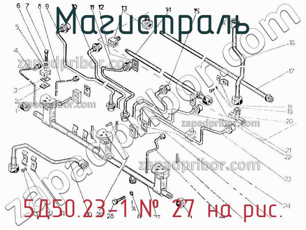 Наш ОТК гарантирует отсутствие брака у всех магистралей представленных на нашем сайте. Для заказа 5Д50.23-1 обращайтесь в отдел продаж. Информация о цене, наличии, сроках поставки, сроке гарантии и по других вопросах обращайтесь по телефонам, указанным в контактах или оставьте заявку через форму обратной связи. Магистраль сливная 5Д50.23-1, номер 27 на чертеже, Трубопровод топливный Д50.23 и другие запасные части для ПДГ4А) , а также другие магистрали и похожие изделия представлены на сайте zapadpribor.com.