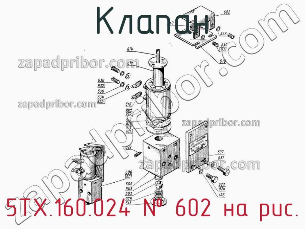 Компания гарантирует отсутствие каких-либо проблем у всех клапанов, их комплектации и документации. Обратитесь в наш отдел продаж, если у вас есть потребность купить 5ТХ.160.024. Наши менеджеры всегда на связи, чтобы ответить на все ваши вопросы. Клапан, номер 602 на чертеже, Вентиль электропневматический включающий ВВ-1, ВВ-1Т и другие запасные части для , а также другие клапаны и похожие изделия представлены на сайте zapadpribor.com.