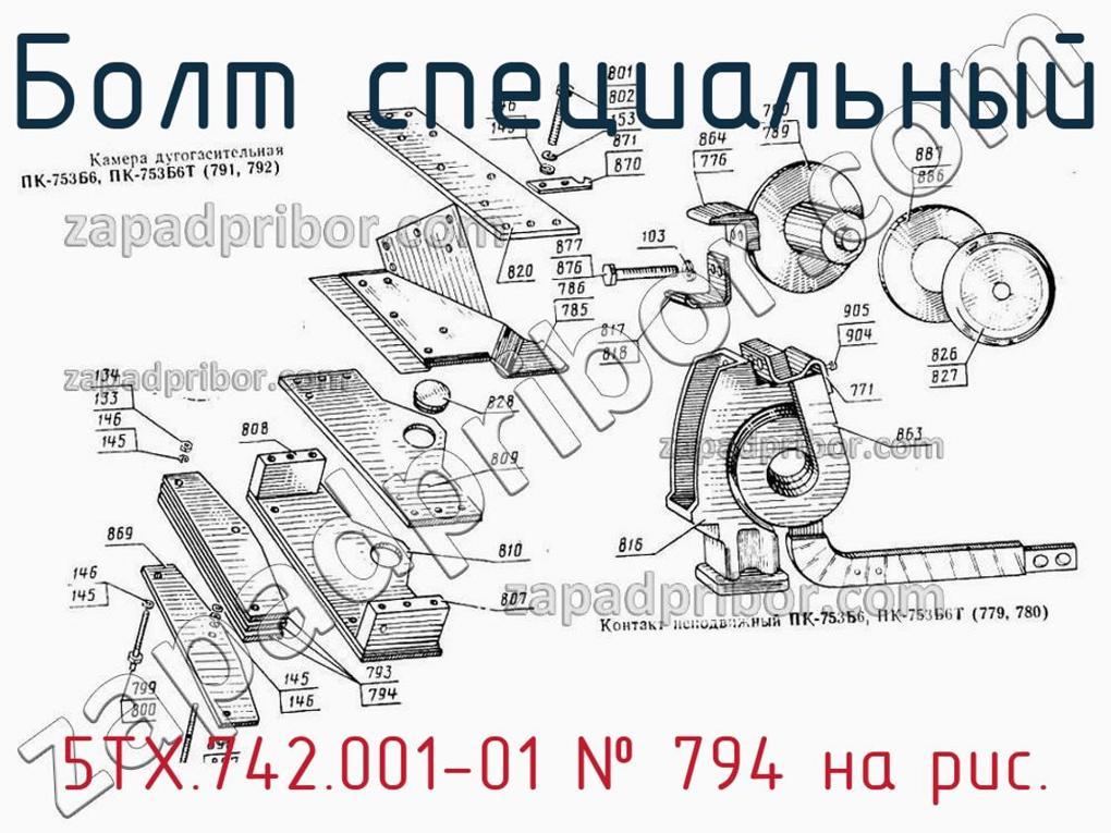 Мы даем гарантию на отсутствие брака или других несоответствий технической документации. Для приобретения 5ТХ.742.001-01 обращайтесь в наш отдел продаж. Информацию о цене, наличию, срокам доставки, гарантии и любые другие вопросы уточняйте у наших менеджеров. Болт специальный, номер 794 на чертеже, Камера дугогасительная,Контакт неподвижный ПК-753Б6, ПК-753Б6Т и другие запасные части для , а также другие болты специальные и похожие изделия представлены на сайте zapadpribor.com.