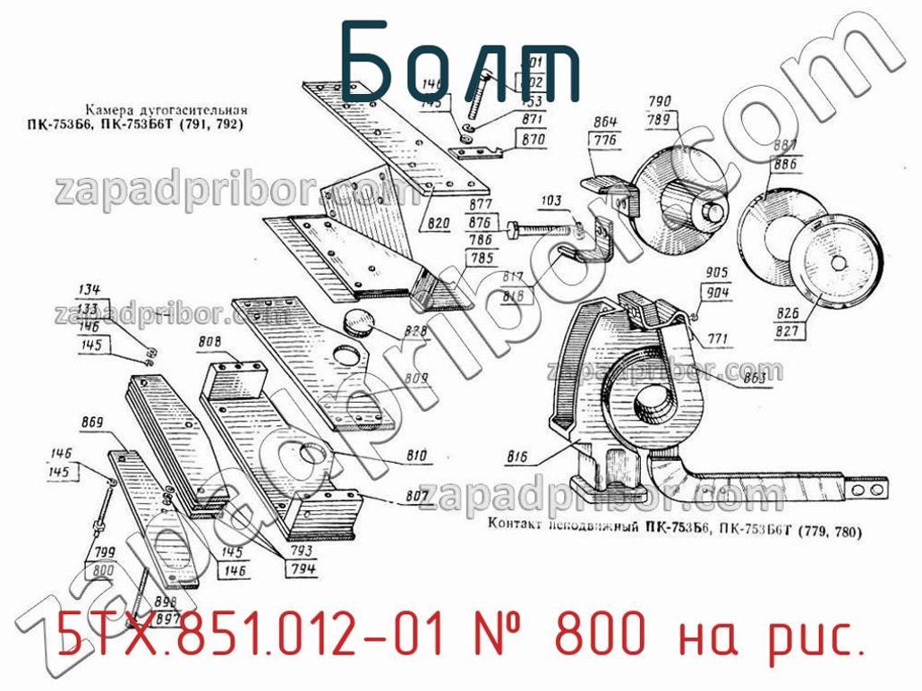 ОТК компании гарантирует отсутствие дефектов у всех болтов на нашем сайте. Для покупки 5ТХ.851.012-01 свяжитесь с отделом продаж. Менеджеры компании предоставят всю информацию о цене, наличии, сроках доставки, гарантии и ответят на любые другие вопросы. Болт, номер 800 на чертеже, Камера дугогасительная,Контакт неподвижный ПК-753Б6, ПК-753Б6Т и другие запасные части для , а также другие болты и похожие изделия представлены на сайте zapadpribor.com.