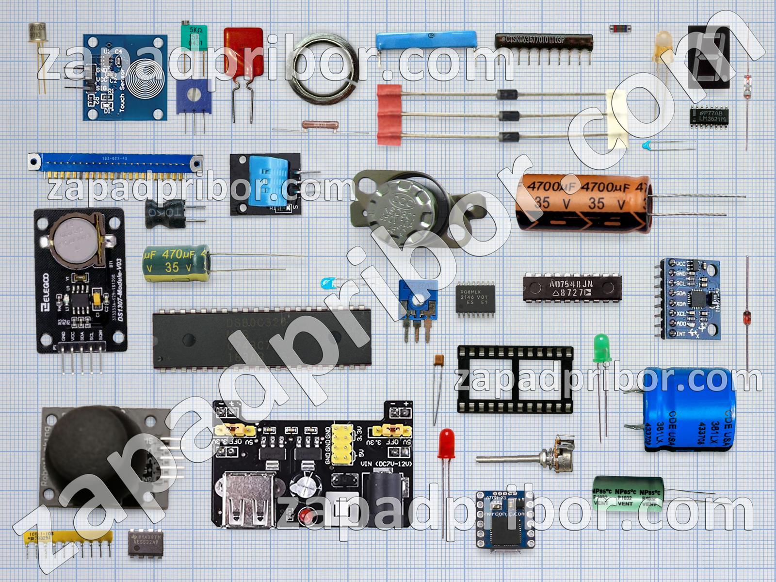 Кроме этих радиодеталей на нашем сайте вы сможете найти большой перечень компонентов. Осуществляйте поиск по основным типам радиодеталей таких как резонатор, конденсатор, трансформатор, переключатель, усилитель, экран, кнопка, резистор, диод, адаптер, реле, преобразователь, тиристор, индикатор, соединитель, микросхема, разъем, дроссель, фотодиод, датчик, тумблер, транзистор, контакты, диодный мост, колодки, дисплей, светодиод, индуктивность и другие.