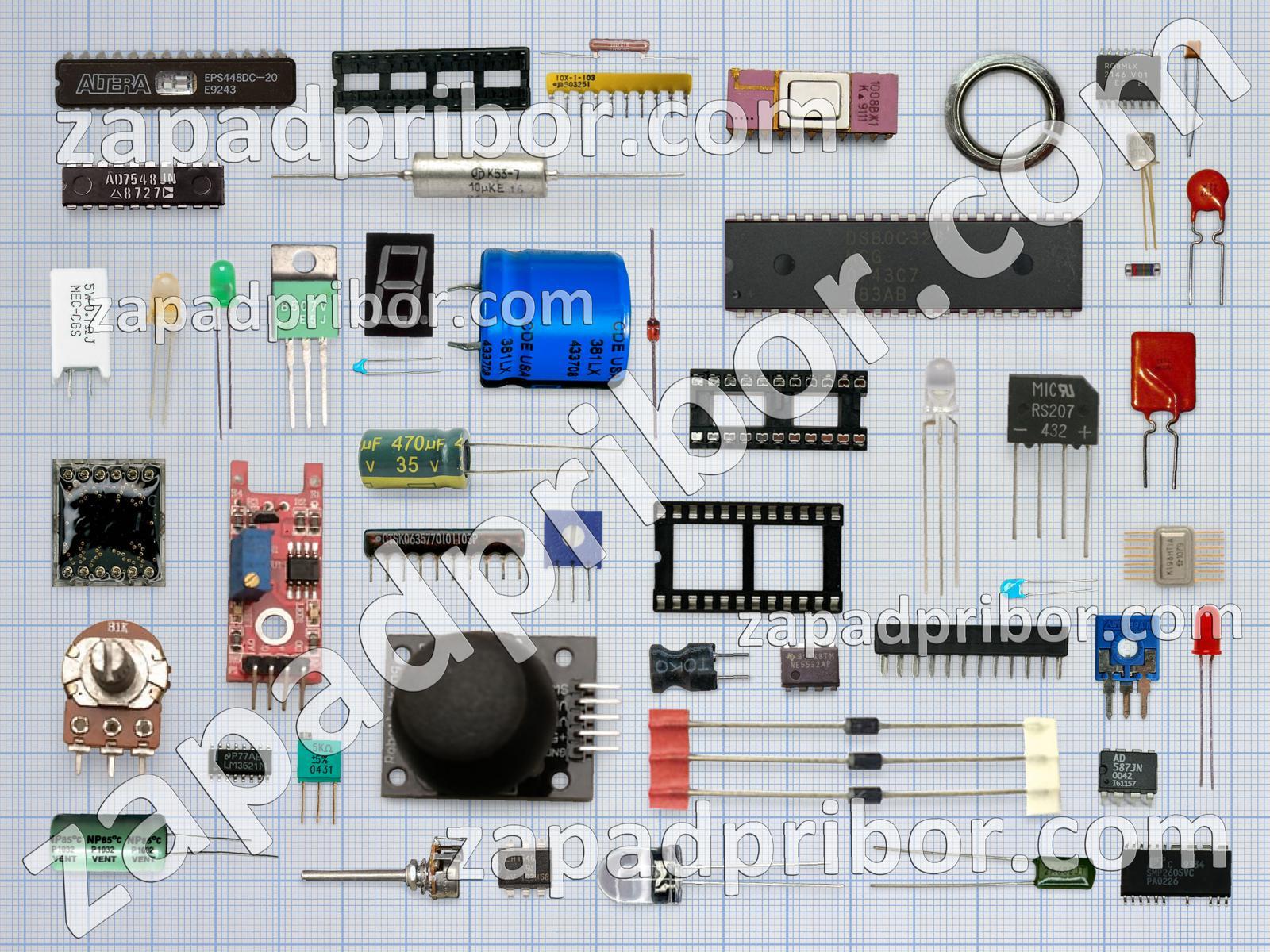 Кроме этих радиодеталей на нашем сайте вы сможете найти большой перечень компонентов. Осуществляйте поиск по основным типам радиодеталей таких как адаптер, резонатор, реле, транзистор, диод, усилитель, контакты, датчик, индуктивность, резистор, кнопка, соединитель, индикатор, конденсатор, тиристор, разъем, диодный мост, фотодиод, дисплей, переключатель, экран, преобразователь, трансформатор, дроссель, колодки, тумблер, светодиод, микросхема и другие.