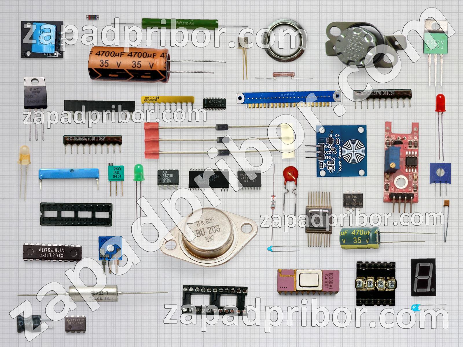 Кроме этих радиодеталей на нашем сайте вы сможете найти большой перечень компонентов. Осуществляйте поиск по основным типам радиодеталей таких как кнопка, дроссель, преобразователь, адаптер, индикатор, контакты, переключатель, усилитель, диод, тумблер, конденсатор, индуктивность, реле, дисплей, соединитель, разъем, колодки, диодный мост, транзистор, трансформатор, резистор, датчик, экран, резонатор, фотодиод, микросхема, тиристор, светодиод и другие.