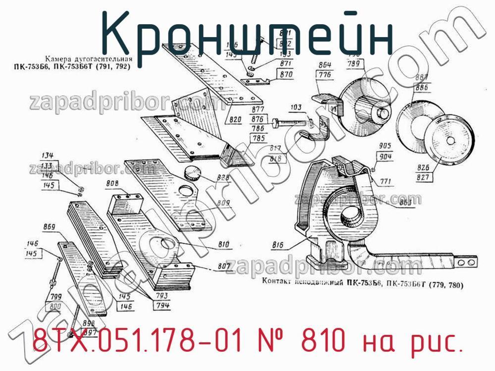Наш отдел технического контроля гарантирует отсутствие брака или других несоответствий в технической документации или комплектации всех кронштейнов представленных на нашем сайте. Чтобы заказать 8ТХ.051.178-01 обращайтесь в отдел продаж. Чтобы узнать цену, наличие, сроки поставки, срок гарантии и другие вопросы позвоните по телефонам указанным в контактах или оставьте заявку через форму обратной связи. Кронштейн, номер 810 на чертеже, Камера дугогасительная,Контакт неподвижный ПК-753Б6, ПК-753Б6Т и другие запасные части для , а также другие кронштейны и похожие изделия представлены на сайте zapadpribor.com.