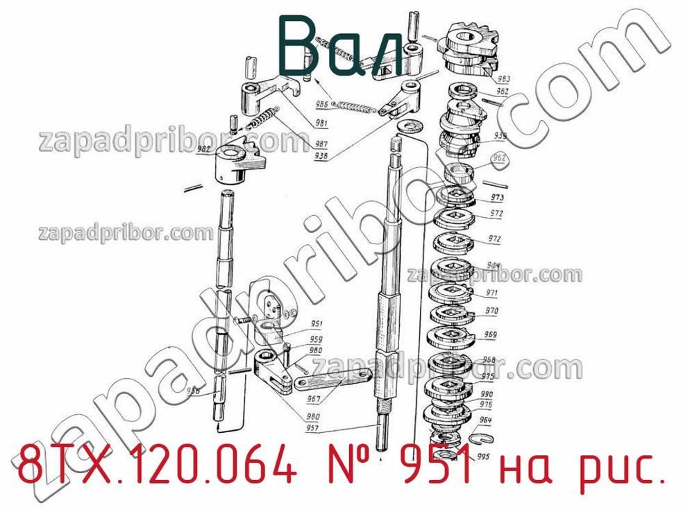 Наш ОТК гарантирует отсутствие брака у всех валов представленных на нашем сайте. Для заказа 8ТХ.120.064 обращайтесь в отдел продаж. Информация о цене, наличии, сроках поставки, сроке гарантии и по других вопросах обращайтесь по телефонам, указанным в контактах или оставьте заявку через форму обратной связи. Вал, номер 951 на чертеже, Вал реверсивный (937), Барабан (940) КВ-0801Т и другие запасные части для , а также другие валы и похожие изделия представлены на сайте zapadpribor.com.