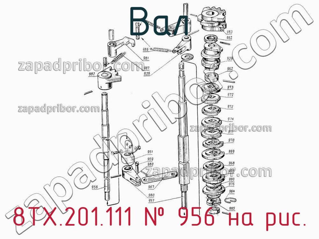 Мы даем гарантию на отсутствие брака или других несоответствий технической документации. Для приобретения 8ТХ.201.111 обращайтесь в наш отдел продаж. Информацию о цене, наличию, срокам доставки, гарантии и любые другие вопросы уточняйте у наших менеджеров. Вал, номер 956 на чертеже, Вал реверсивный (937), Барабан (940) КВ-0801Т и другие запасные части для , а также другие валы и похожие изделия представлены на сайте zapadpribor.com.