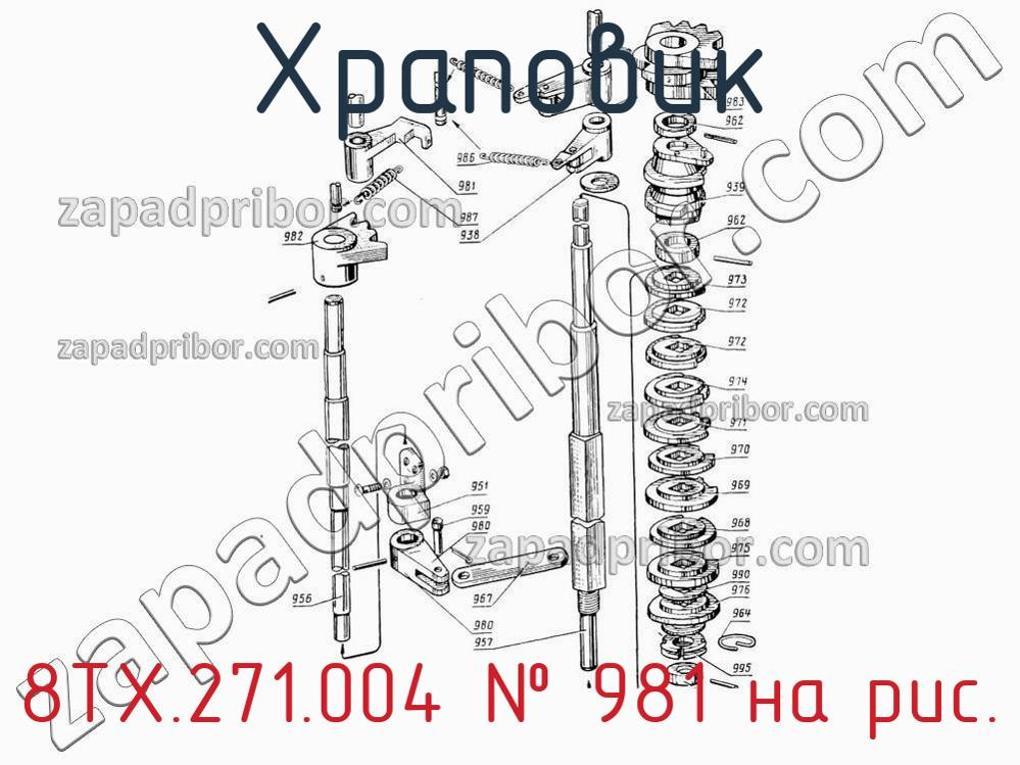 Наш ОТК гарантирует отсутствие брака у всех храповиков представленных на нашем сайте. Для заказа 8ТХ.271.004 обращайтесь в отдел продаж. Информация о цене, наличии, сроках поставки, сроке гарантии и по других вопросах обращайтесь по телефонам, указанным в контактах или оставьте заявку через форму обратной связи. Храповик, номер 981 на чертеже, Вал реверсивный (937), Барабан (940) КВ-0801Т и другие запасные части для , а также другие храповики и похожие изделия представлены на сайте zapadpribor.com.
