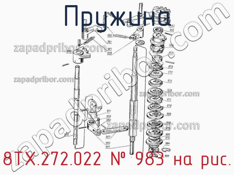 Наш отдел технического контроля гарантирует отсутствие брака и других несоответствий технической документации у всех пружин представленных на нашем сайте. По вопросам покупки 8ТХ.272.022 обращайтесь в отдел продаж. Для информации о цене, наличии, сроках поставки, сроке гарантии и по других вопросах обращайтесь по телефонам, указанным в контактах или оставьте запрос через форму обратной связи. Пружина, номер 983 на чертеже, Вал реверсивный (937), Барабан (940) КВ-0801Т и другие запасные части для , а также другие пружины и похожие изделия представлены на сайте zapadpribor.com.