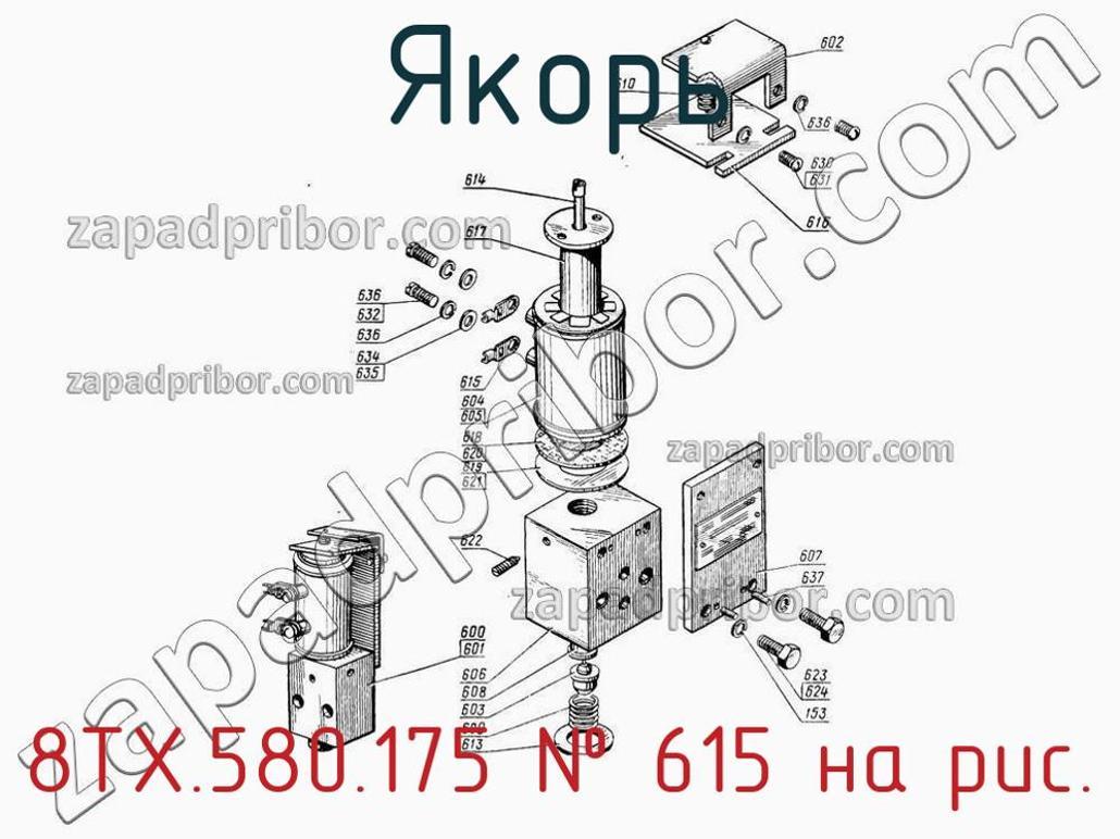 Наш отдел технического контроля гарантирует отсутствие брака и других несоответствий технической документации у всех якорей представленных на нашем сайте. По вопросам покупки 8ТХ.580.175 обращайтесь в отдел продаж. Для информации о цене, наличии, сроках поставки, сроке гарантии и по других вопросах обращайтесь по телефонам, указанным в контактах или оставьте запрос через форму обратной связи. Якорь, номер 615 на чертеже, Вентиль электропневматический включающий ВВ-1, ВВ-1Т и другие запасные части для , а также другие якоря и похожие изделия представлены на сайте zapadpribor.com.