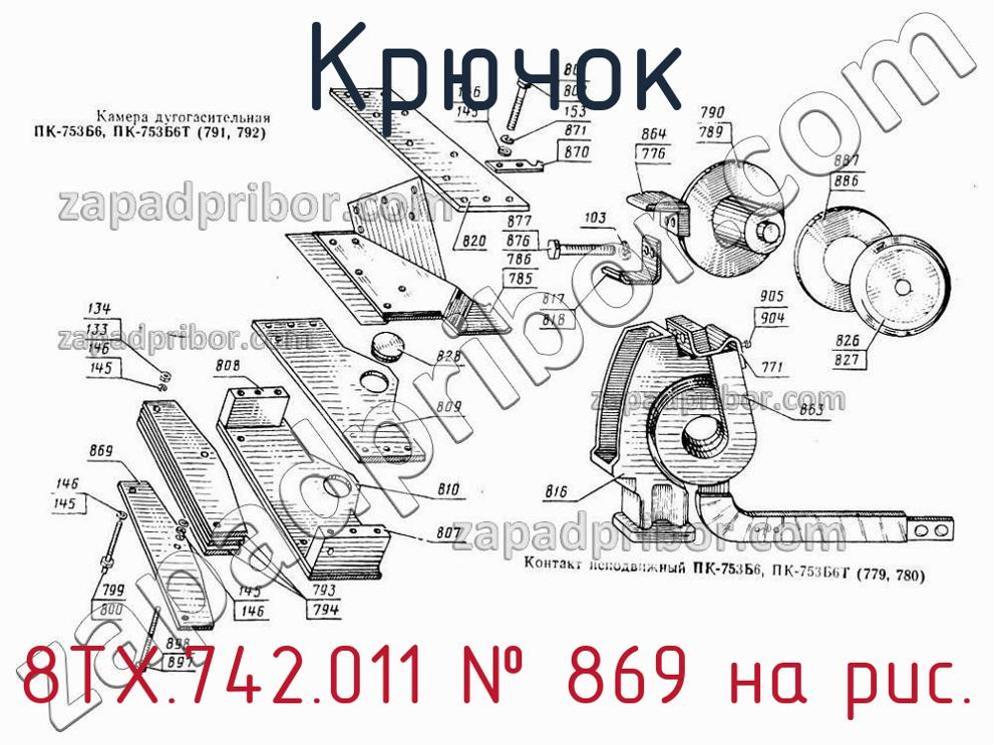 Наш отдел технического контроля гарантирует отсутствие брака или других несоответствий в технической документации или комплектации всех крючков представленных на нашем сайте. Чтобы заказать 8ТХ.742.011 обращайтесь в отдел продаж. Чтобы узнать цену, наличие, сроки поставки, срок гарантии и другие вопросы позвоните по телефонам указанным в контактах или оставьте заявку через форму обратной связи. Крючок, номер 869 на чертеже, Камера дугогасительная,Контакт неподвижный ПК-753Б6, ПК-753Б6Т и другие запасные части для , а также другие крючки и похожие изделия представлены на сайте zapadpribor.com.