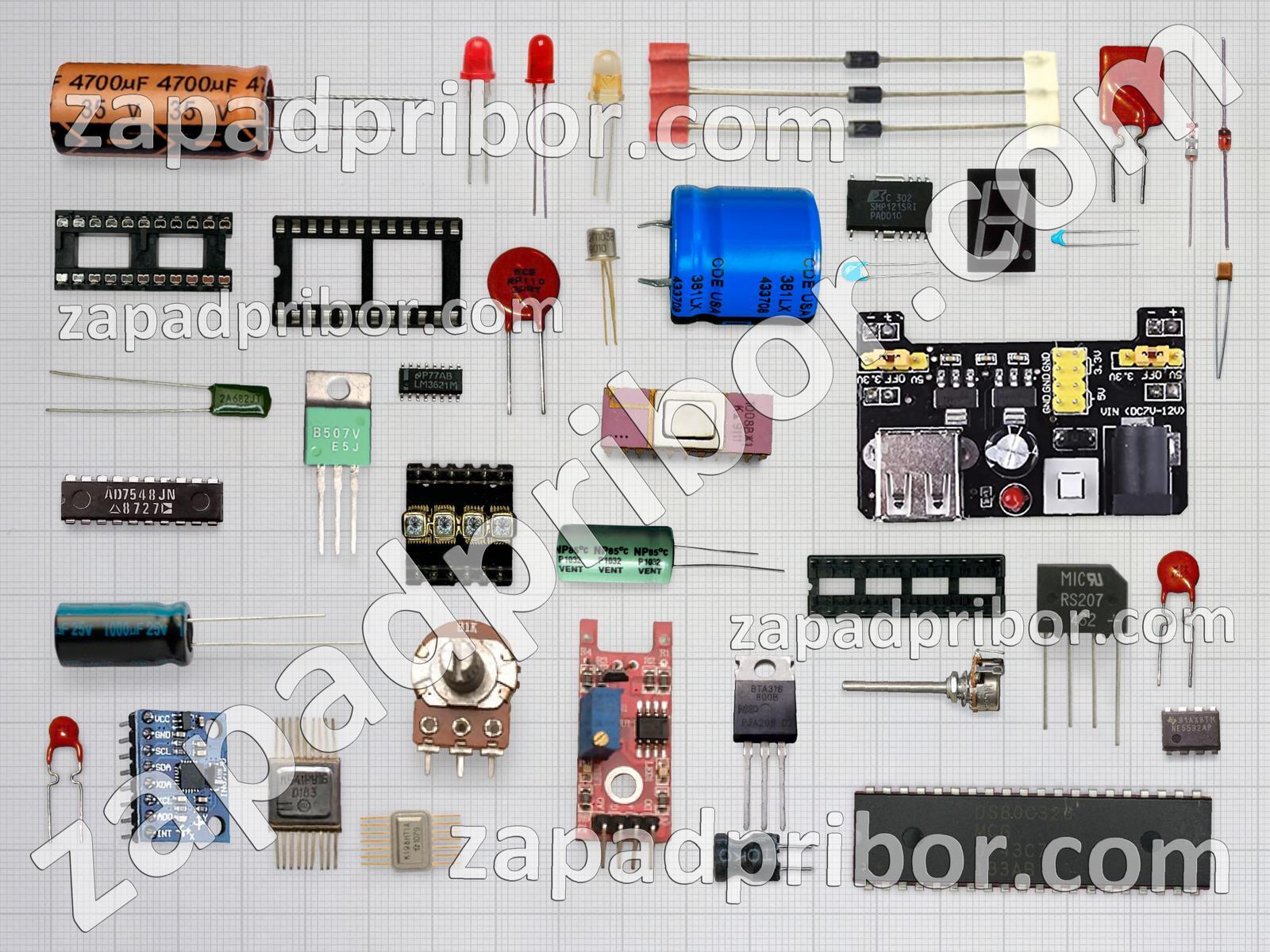 Кроме этих радиодеталей на нашем сайте вы сможете найти большой перечень компонентов. Осуществляйте поиск по основным типам радиодеталей таких как тиристор, дроссель, усилитель, адаптер, разъем, фотодиод, конденсатор, диодный мост, трансформатор, индикатор, экран, преобразователь, транзистор, индуктивность, резистор, реле, переключатель, микросхема, светодиод, контакты, кнопка, тумблер, диод, датчик, резонатор, колодки, дисплей, соединитель и другие.