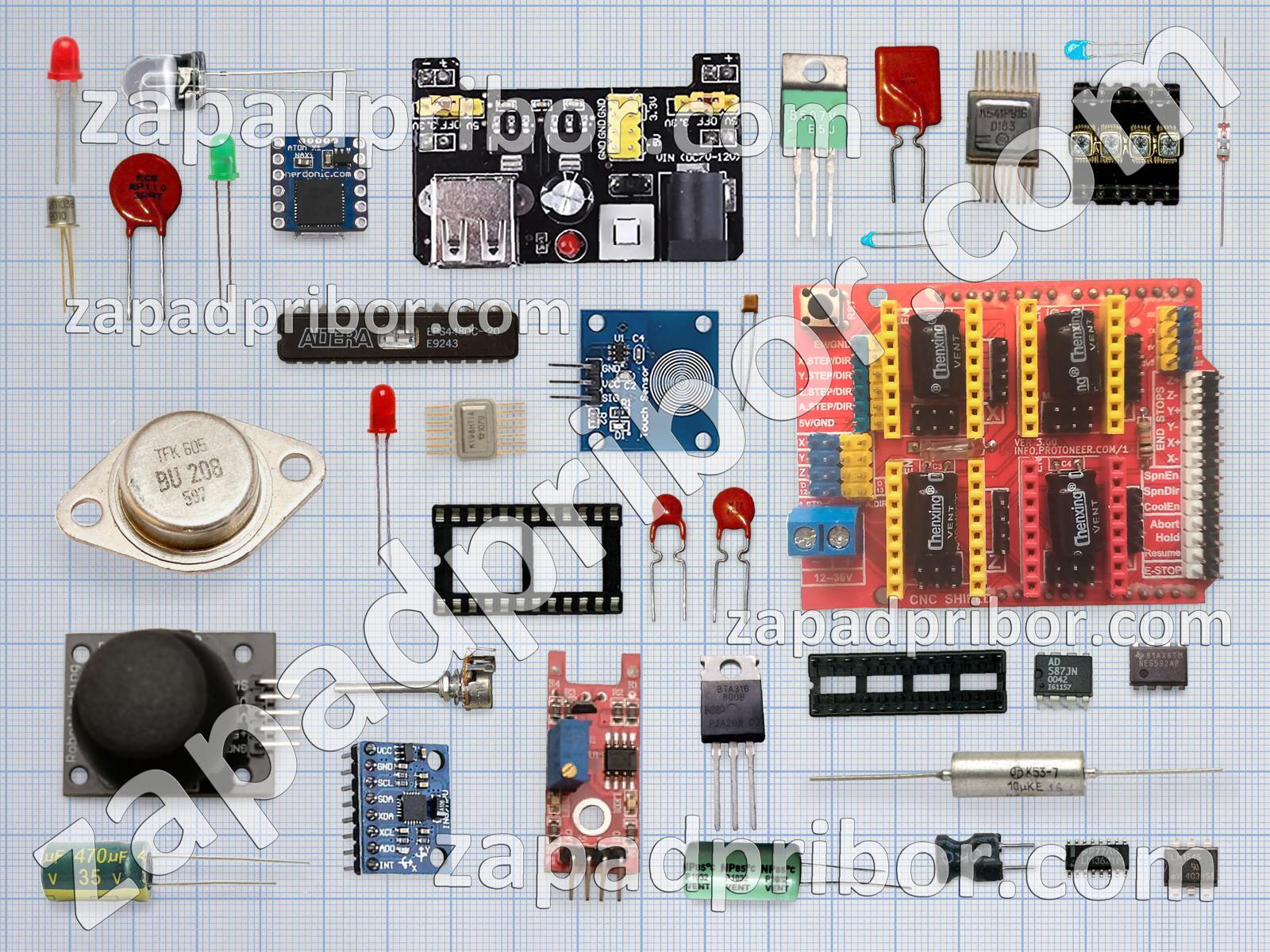 Кроме этих радиодеталей на нашем сайте вы сможете найти большой перечень компонентов. Осуществляйте поиск по основным типам радиодеталей таких как колодки, соединитель, дроссель, фотодиод, диод, переключатель, микросхема, преобразователь, резонатор, экран, тумблер, резистор, реле, диодный мост, разъем, датчик, светодиод, индикатор, конденсатор, транзистор, адаптер, трансформатор, кнопка, дисплей, индуктивность, усилитель, тиристор, контакты и другие.