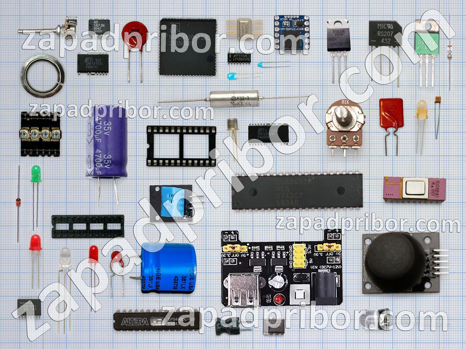 Кроме этих радиодеталей на нашем сайте вы сможете найти большой перечень компонентов. Осуществляйте поиск по основным типам радиодеталей таких как конденсатор, резонатор, контакты, экран, тумблер, резистор, датчик, реле, дроссель, диодный мост, усилитель, переключатель, индуктивность, адаптер, кнопка, светодиод, дисплей, разъем, тиристор, преобразователь, фотодиод, трансформатор, колодки, микросхема, соединитель, диод, индикатор, транзистор и другие.