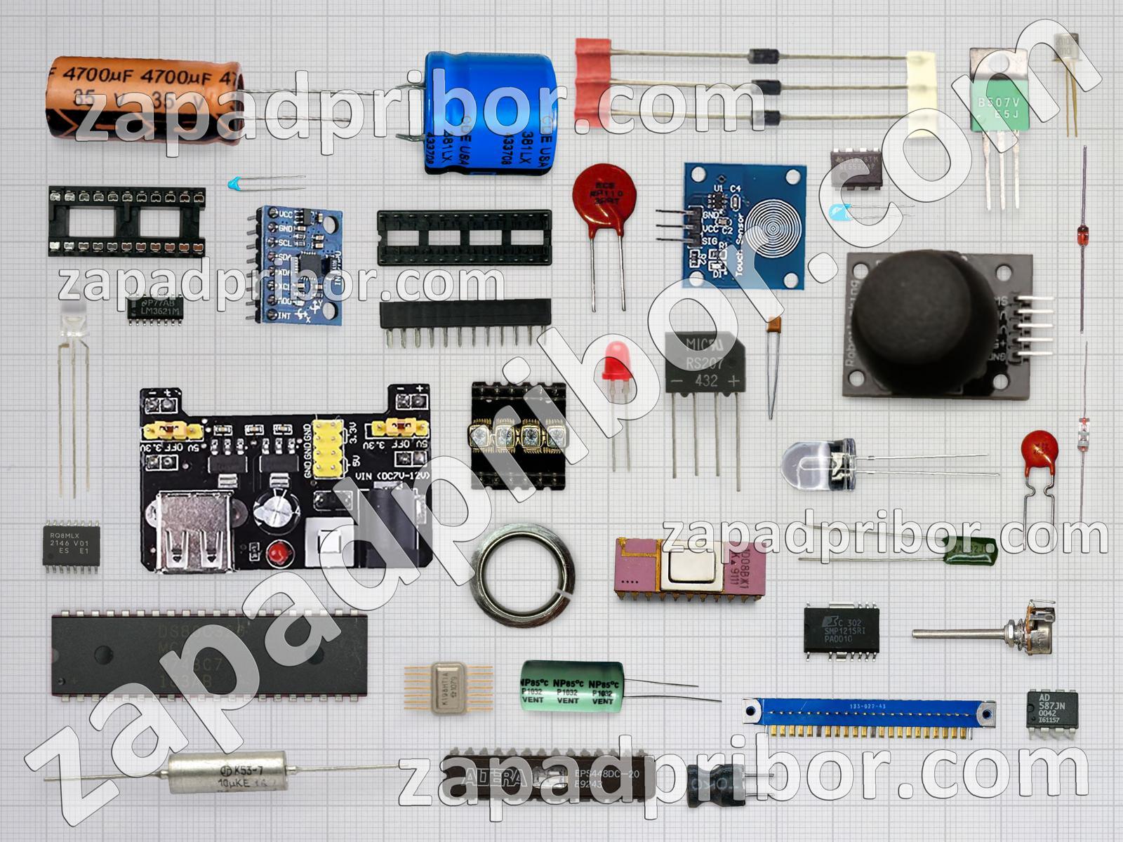 Кроме этих радиодеталей на нашем сайте вы сможете найти большой перечень компонентов. Осуществляйте поиск по основным типам радиодеталей таких как резистор, переключатель, трансформатор, соединитель, индикатор, светодиод, усилитель, дисплей, диод, дроссель, контакты, колодки, датчик, адаптер, экран, тиристор, фотодиод, кнопка, реле, конденсатор, диодный мост, преобразователь, микросхема, тумблер, резонатор, индуктивность, транзистор, разъем и другие.