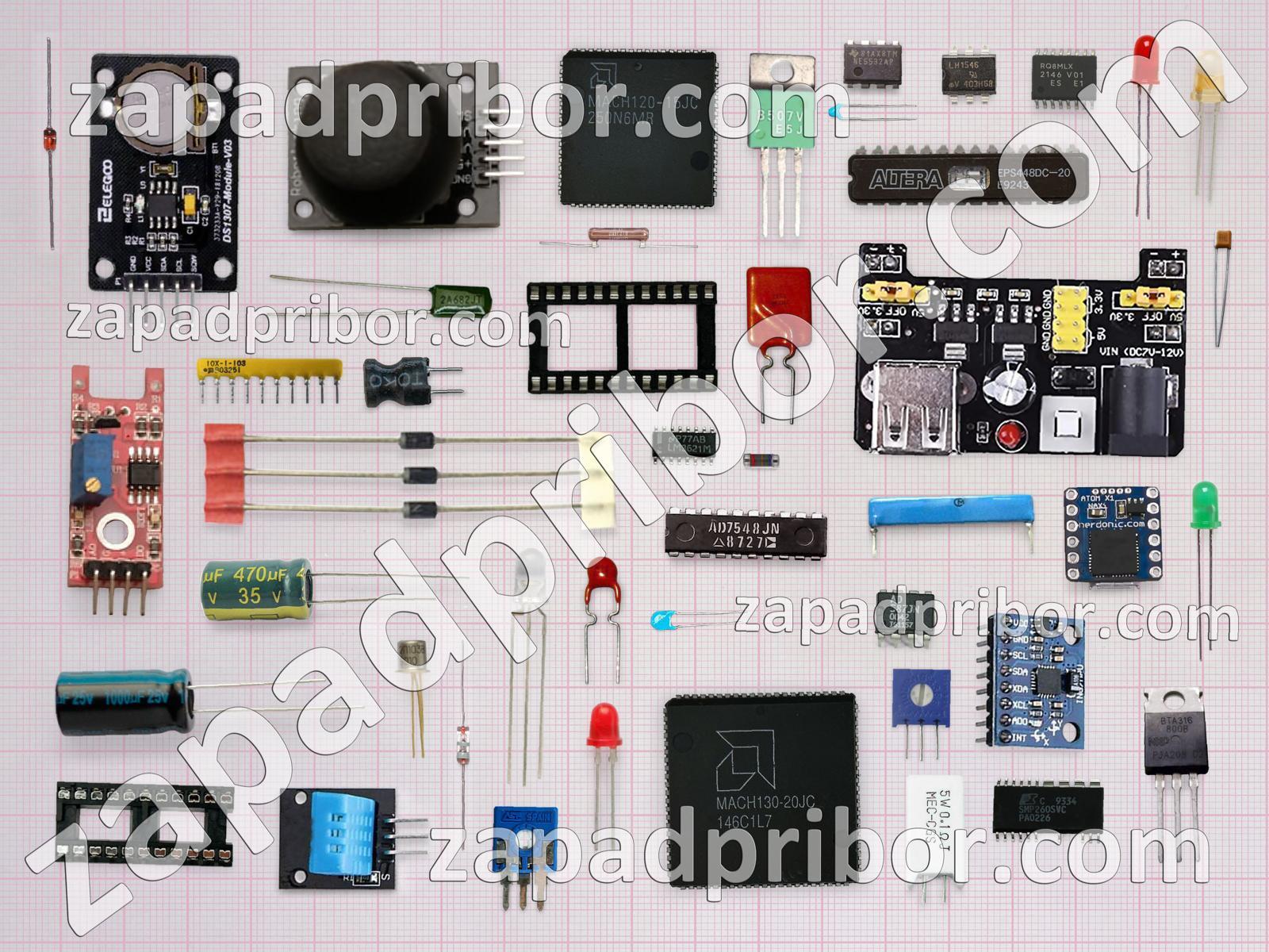Кроме этих радиодеталей на нашем сайте вы сможете найти большой перечень компонентов. Осуществляйте поиск по основным типам радиодеталей таких как тиристор, соединитель, индикатор, транзистор, контакты, резистор, преобразователь, реле, диод, колодки, дроссель, трансформатор, конденсатор, усилитель, тумблер, адаптер, светодиод, разъем, экран, индуктивность, дисплей, резонатор, переключатель, диодный мост, фотодиод, кнопка, микросхема, датчик и другие.