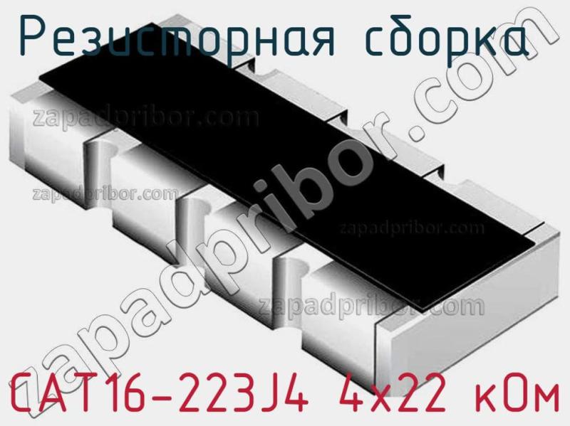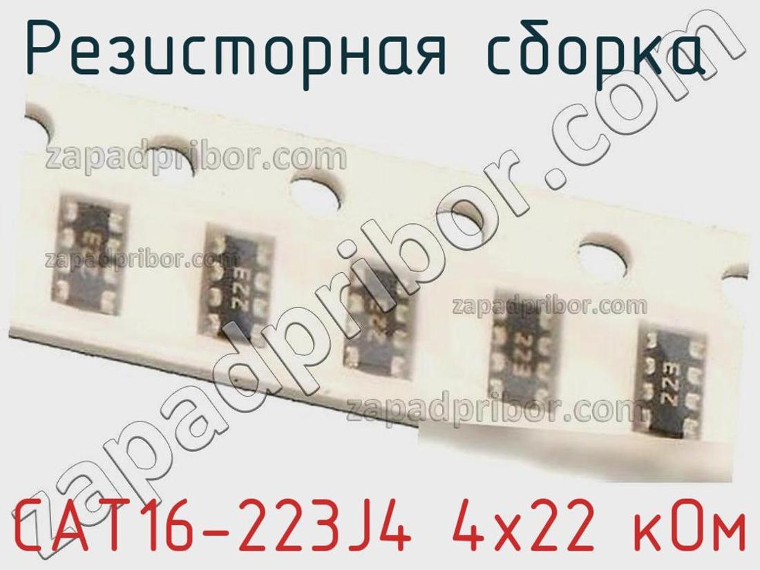 Основные характеристики резисторной сборки CAT16-223J4 4х22 кОм : CAT16-223J4 4х22 кОм, резисторная сборка (SMD)Чип- Резисторные сборки (smd resistor network) широко применяются в телекоммуникационном оборудовании, бытовых и промышленных электроприборах. Они оптимальны в случае необходимости экономии места на печатной плате. Основным преимуществом чип резисторных сборок перед сборками в dip корпусе является малая рассеиваемая мощность. Керамика чип резисторных сборок имеет сверху защитное покрытие, выводы соединены с металлизацией на керамике. Серия CAY отличается выпуклыми выводами. У сборок серии CAT выводы вогнутые. В сборках обеих серий 2, 4 или 8 резисторов.