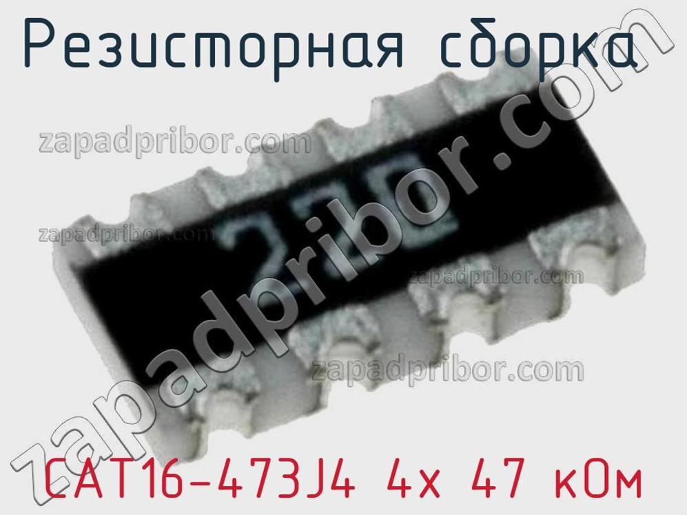 Основные характеристики резисторной сборки CAT16-473J4 4х 47 кОм : CAT16-473J4 4х 47 кОм, резисторная сборка (SMD)Чип- Резисторные сборки (smd resistor network) широко применяются в телекоммуникационном оборудовании, бытовых и промышленных электроприборах. Они оптимальны в случае необходимости экономии места на печатной плате. Основным преимуществом чип резисторных сборок перед сборками в dip корпусе является малая рассеиваемая мощность. Керамика чип резисторных сборок имеет сверху защитное покрытие, выводы соединены с металлизацией на керамике. Серия CAY отличается выпуклыми выводами. У сборок серии CAT выводы вогнутые. В сборках обеих серий 2, 4 или 8 резисторов.