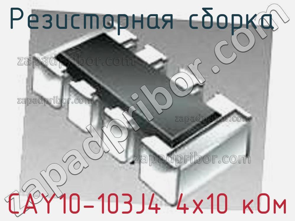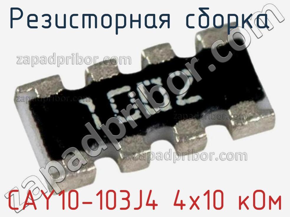 Основные характеристики резисторной сборки CAY10-103J4 4x10 кОм : CAY10-103J4 4x10 кОм, резисторная сборка (SMD)Чип- Резисторные сборки (smd resistor network) широко применяются в телекоммуникационном оборудовании, бытовых и промышленных электроприборах. Они оптимальны в случае необходимости экономии места на печатной плате. Основным преимуществом чип резисторных сборок перед сборками в dip корпусе является малая рассеиваемая мощность. Керамика чип резисторных сборок имеет сверху защитное покрытие, выводы соединены с металлизацией на керамике. Серия CAY отличается выпуклыми выводами. У сборок серии CAT выводы вогнутые. В сборках обеих серий 2, 4 или 8 резисторов.