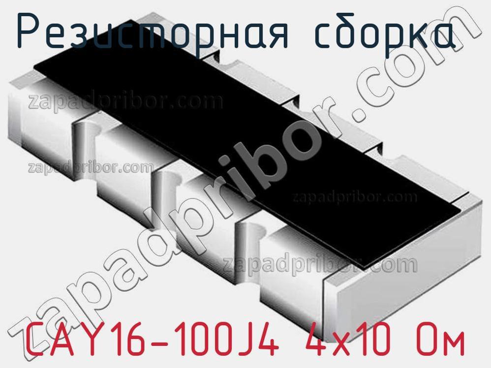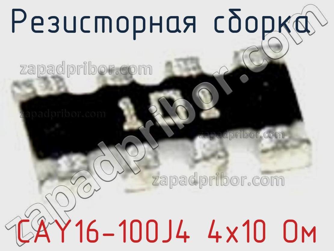 Основные характеристики резисторной сборки CAY16-100J4 4х10 Ом : CAY16-100J4 4х10 Ом, резисторная сборка (SMD)Чип- Резисторные сборки (smd resistor network) широко применяются в телекоммуникационном оборудовании, бытовых и промышленных электроприборах. Они оптимальны в случае необходимости экономии места на печатной плате. Основным преимуществом чип резисторных сборок перед сборками в dip корпусе является малая рассеиваемая мощность. Керамика чип резисторных сборок имеет сверху защитное покрытие, выводы соединены с металлизацией на керамике. Серия CAY отличается выпуклыми выводами. У сборок серии CAT выводы вогнутые. В сборках обеих серий 2, 4 или 8 резисторов.