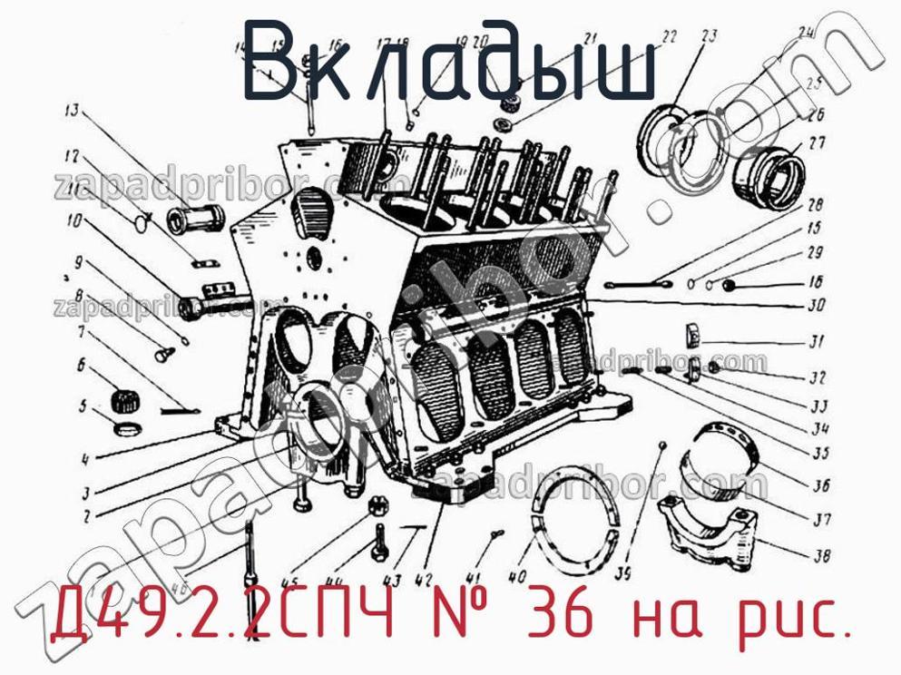 Наш отдел технического контроля гарантирует отсутствие брака и других несоответствий технической документации у всех вкладышей представленных на нашем сайте. По вопросам покупки Д49.2.2СПЧ обращайтесь в отдел продаж. Для информации о цене, наличии, сроках поставки, сроке гарантии и по других вопросах обращайтесь по телефонам, указанным в контактах или оставьте запрос через форму обратной связи. Вкладыш верхний, номер 36 на чертеже, Блок цилиндров 3А-6Д49.35спч и другие запасные части для 49 (Ч 26/26) , а также другие вкладыши и похожие изделия представлены на сайте zapadpribor.com.