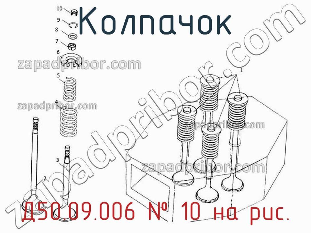 Мы даем гарантию на отсутствие брака или других несоответствий технической документации у всех колпачков. Для приобритения Д50.09.006 - обратитесь в наш отдел продаж. Чтобы получить более подробную информацию о товаре, его доставке или у вас есть любой другой вопрос - позвоните нам и мы поможем вам окончательно определиться по поводу приобретения этого товара. Колпачок Д50.09.006, номер 10 на чертеже, Клапан впускной Д50.09.009 и выпускной Д50.09.010 и другие запасные части для ПДГ4А) , а также другие колпачки и похожие изделия представлены на сайте zapadpribor.com.