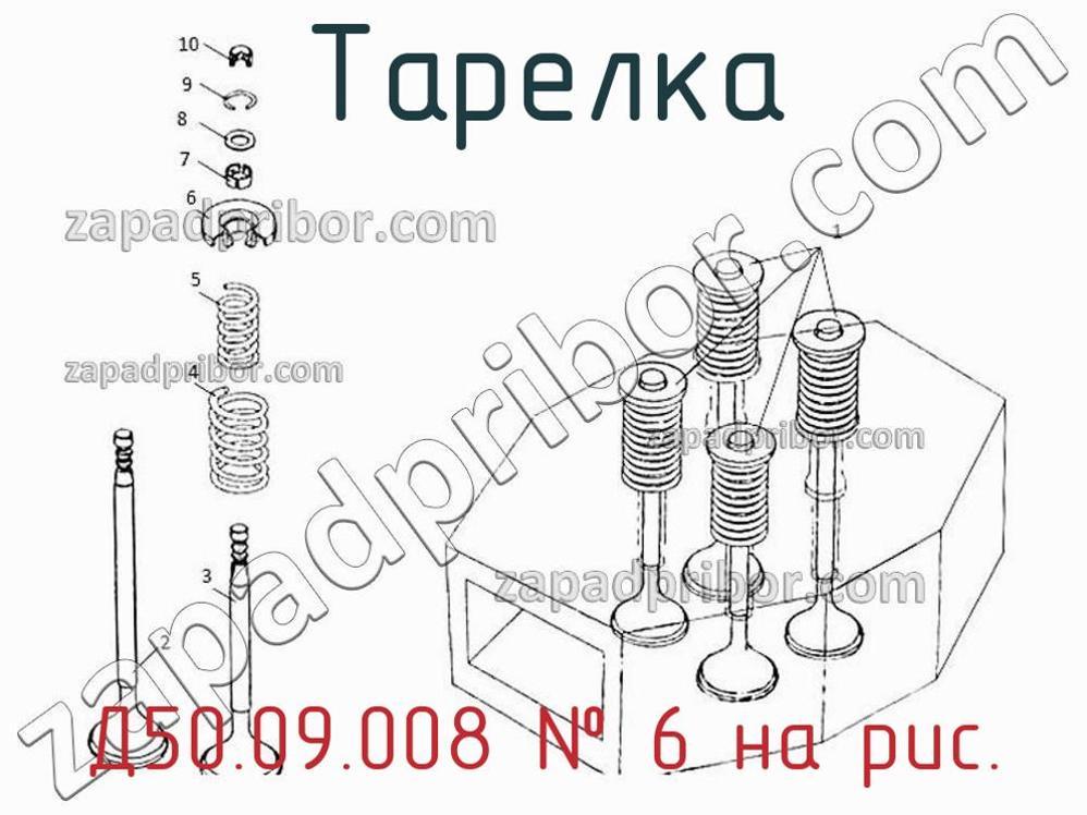 Наш ОТК гарантирует отсутствие брака у всех тарелок представленных на нашем сайте. Для заказа Д50.09.008 обращайтесь в отдел продаж. Информация о цене, наличии, сроках поставки, сроке гарантии и по других вопросах обращайтесь по телефонам, указанным в контактах или оставьте заявку через форму обратной связи. Тарелка клапанной пружины Д50.09.008, номер 6 на чертеже, Клапан впускной Д50.09.009 и выпускной Д50.09.010 и другие запасные части для ПДГ4А) , а также другие тарелки и похожие изделия представлены на сайте zapadpribor.com.
