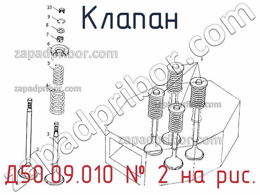 Наш отдел технического контроля гарантирует отсутствие брака и других несоответствий технической документации у всех клапанов представленных на нашем сайте. Для заказа Д50.09.010 обращайтесь в наш отдел продаж. Для получения более подробной информации о товаре, его доставке или у вас есть любой другой вопрос - позвоните нам и мы поможем вам окончательно определиться по поводу приобретения этого товара. Клапан выпускной Д50.09.010, номер 2 на чертеже, Клапан впускной Д50.09.009 и выпускной Д50.09.010 и другие запасные части для ПДГ4А) , а также другие клапаны и похожие изделия представлены на сайте zapadpribor.com.