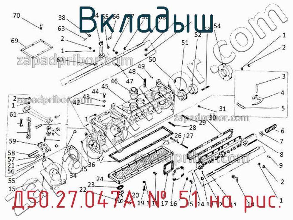 Наш отдел технического контроля перед отгрузкой тестирует каждый прибор в лаборатории на соответствие всем техническим характеристикам и требованиям. Чтобы заказать Д50.27.047А свяжитесь с нашим отделом продаж. Также вы всегда можете позвонить нашим менеджерам чтобы получить более подробную информацию. Вкладыш средний Д50.27.047А, номер 51 на чертеже, Насос топливный 27гр.-031 и другие запасные части для ПДГ4А) , а также другие вкладыши и похожие изделия представлены на сайте zapadpribor.com.
