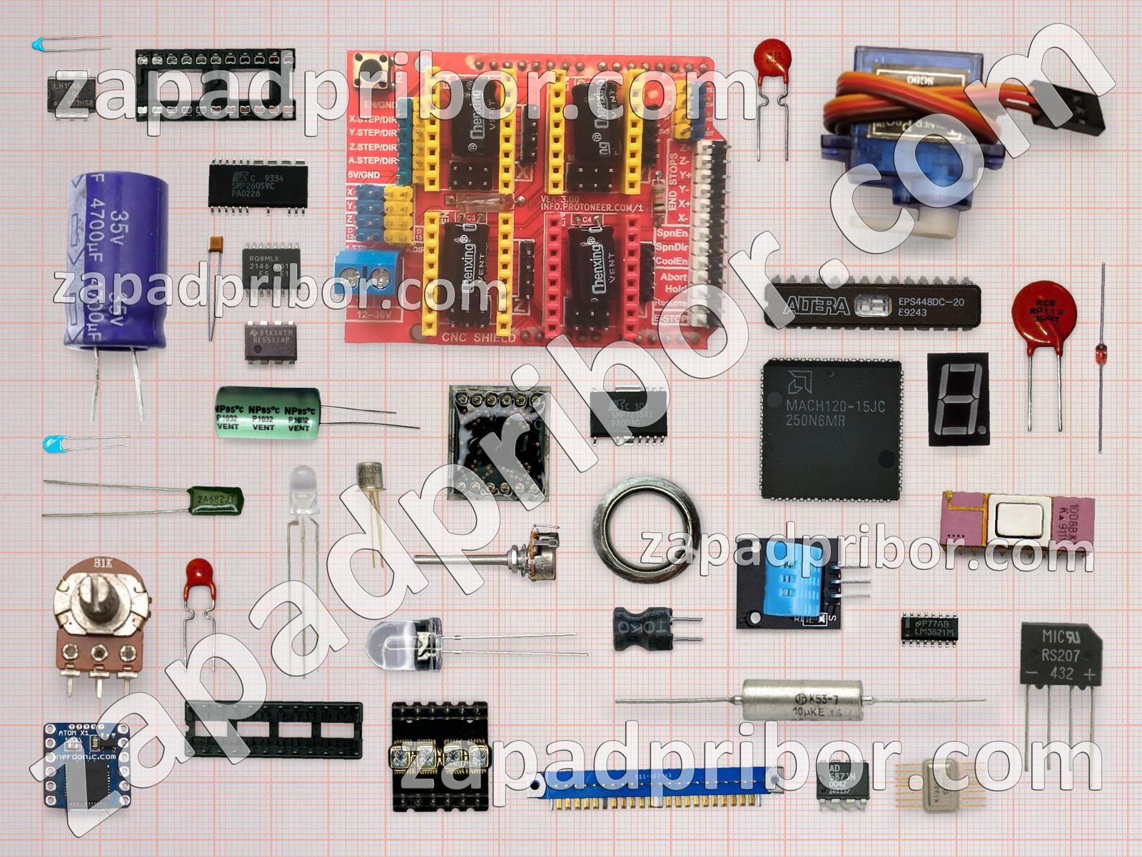 Кроме этих радиодеталей на нашем сайте вы сможете найти большой перечень компонентов. Осуществляйте поиск по основным типам радиодеталей таких как резонатор, дисплей, переключатель, тумблер, дроссель, трансформатор, транзистор, преобразователь, светодиод, контакты, адаптер, колодки, диод, кнопка, усилитель, датчик, индуктивность, тиристор, экран, конденсатор, разъем, индикатор, фотодиод, диодный мост, резистор, микросхема, реле, соединитель и другие.